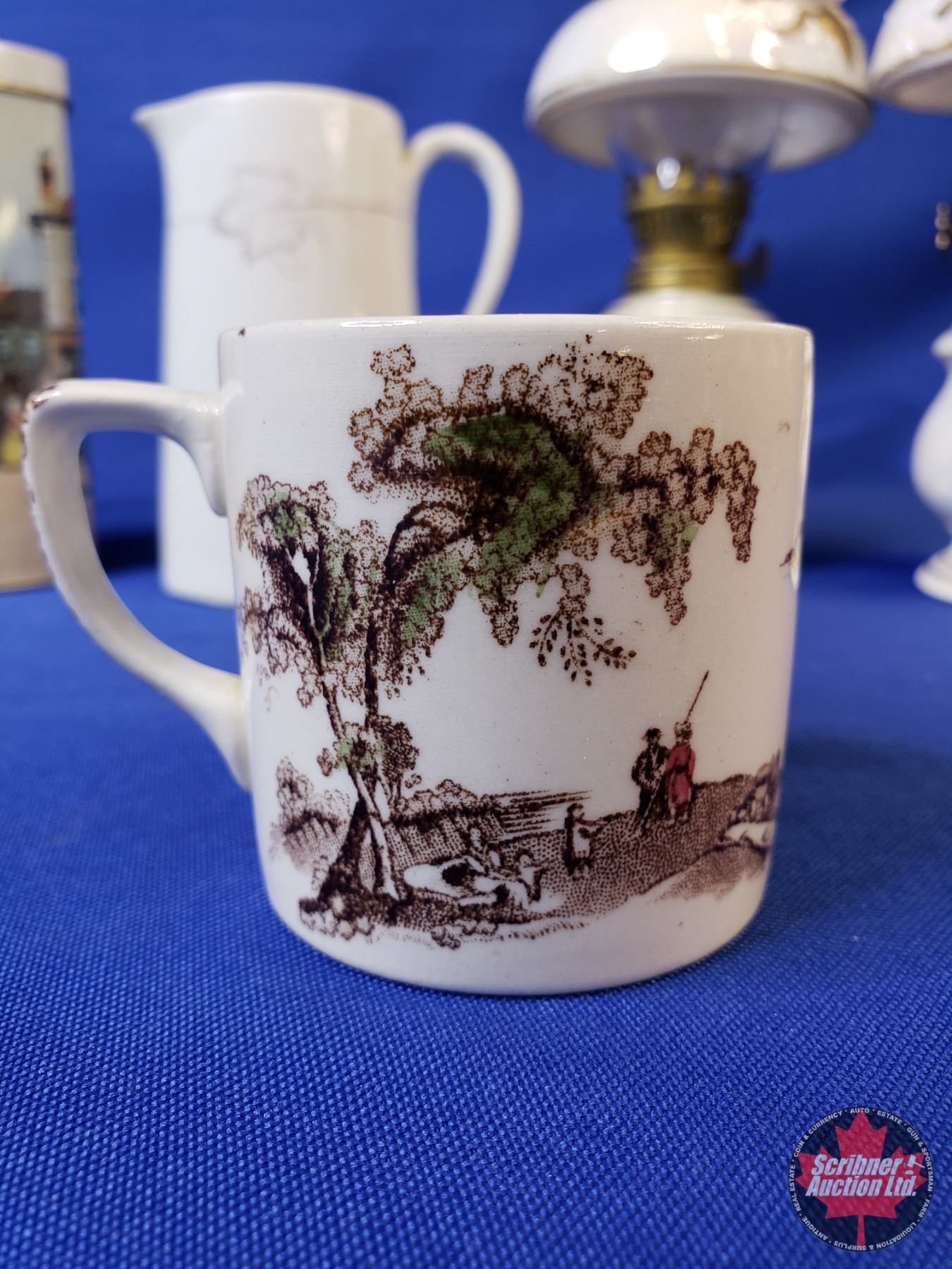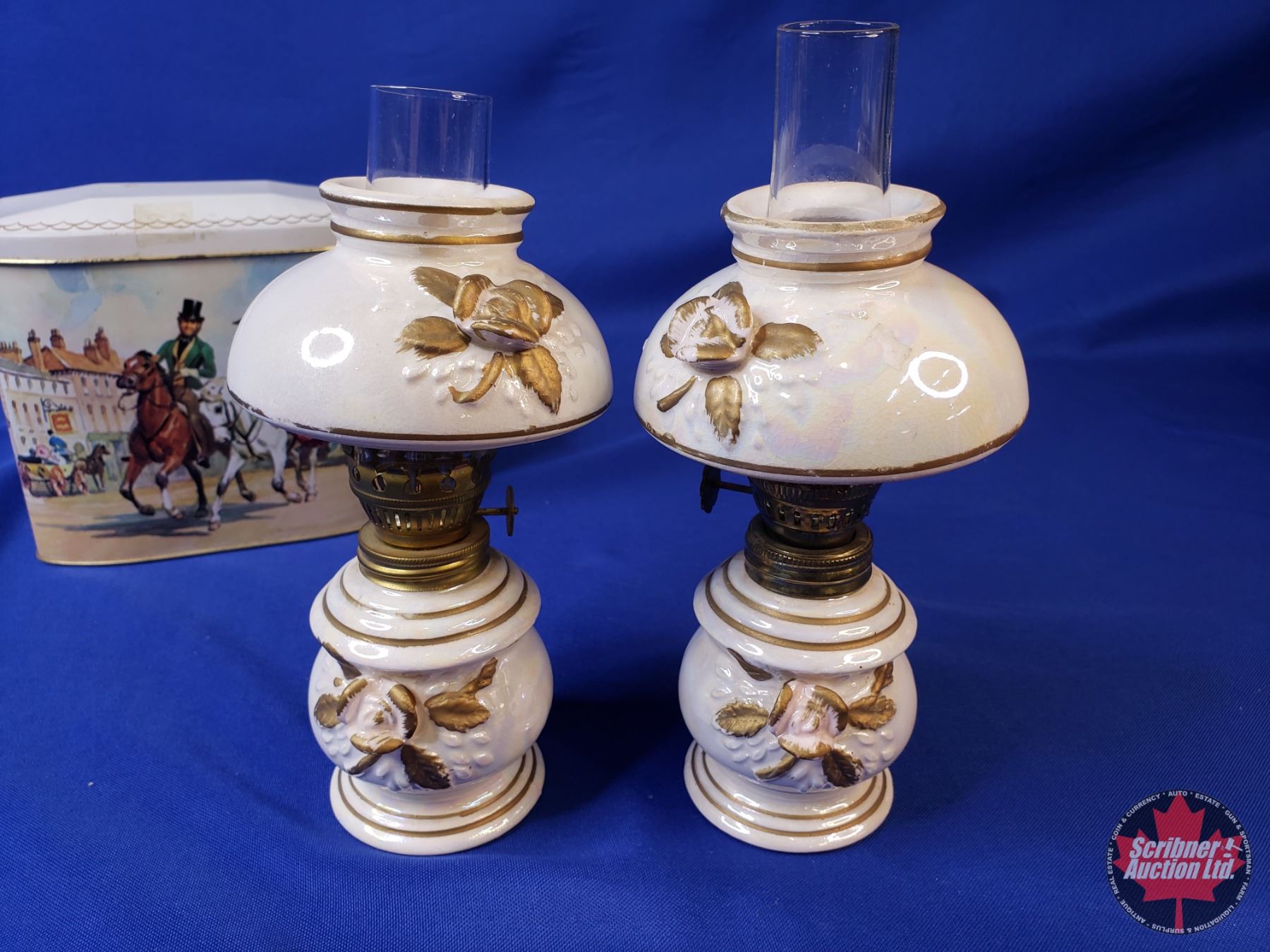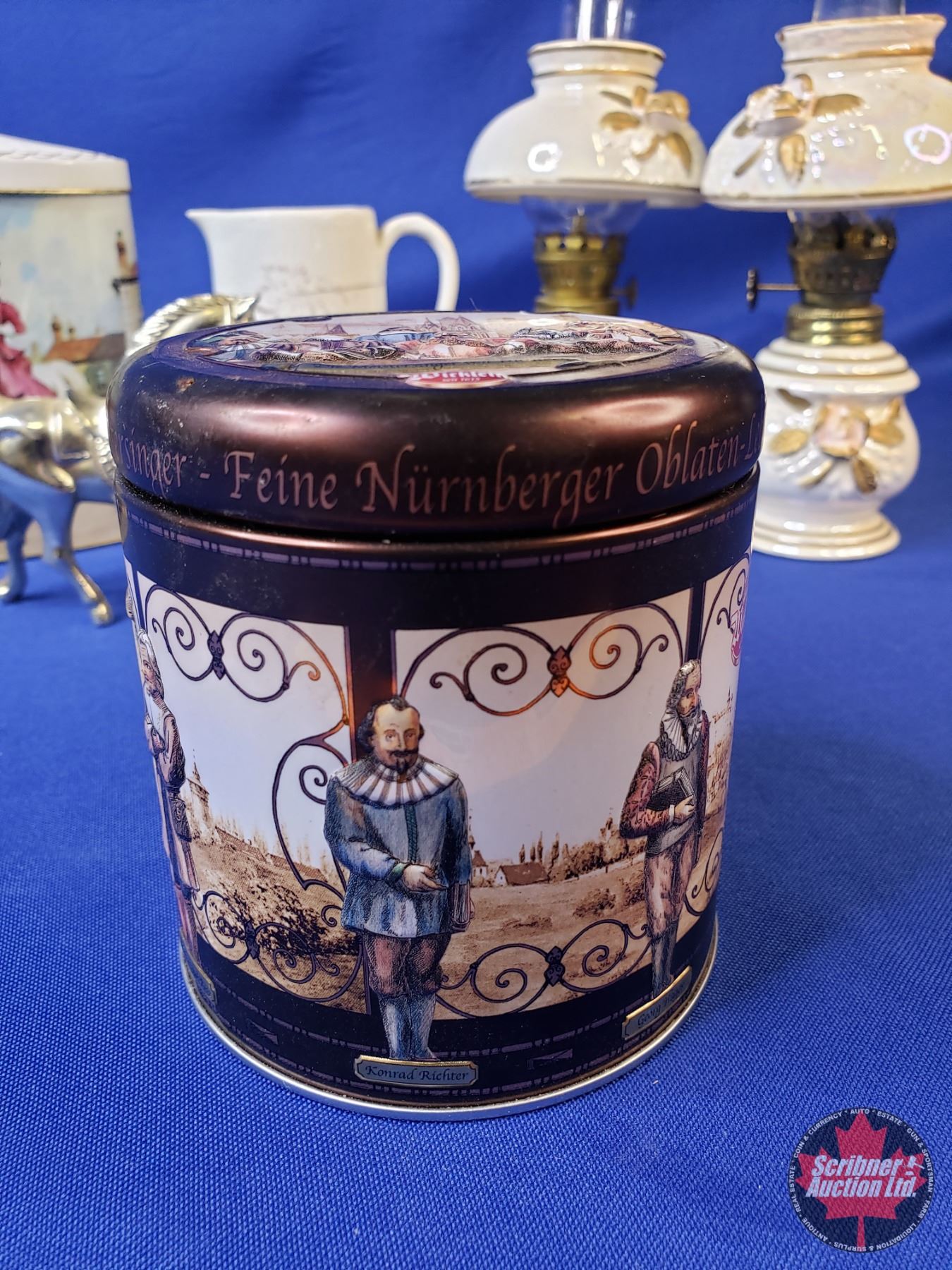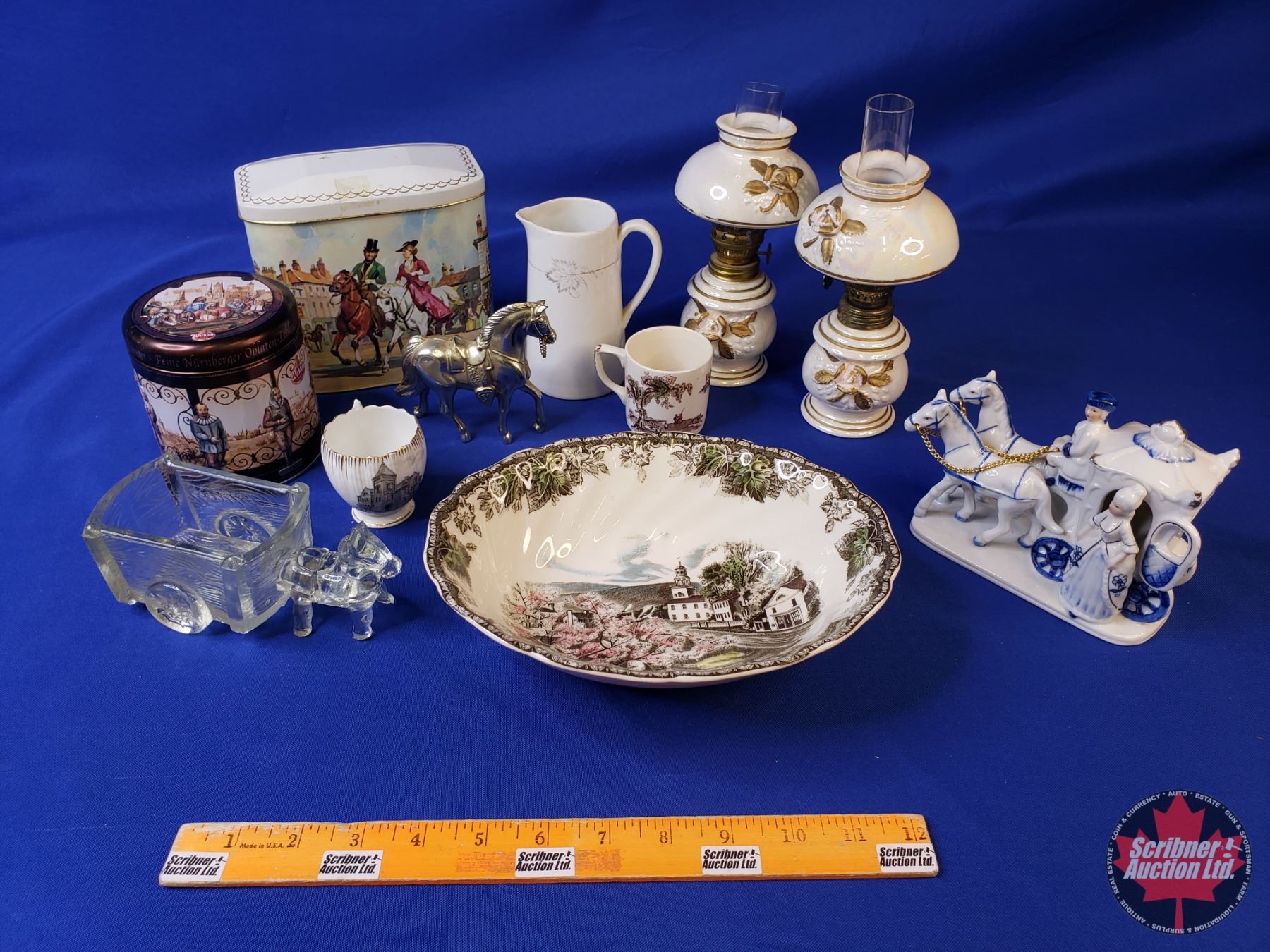 Collector Combo - Victorian Theme: Small Oil Lamps; Bowl "Johnson Bros" ; Pitcher; Tins; Ornaments; etc (Look at Photos for Makers Marks/Labels/Stampings) (SEE PICS!)