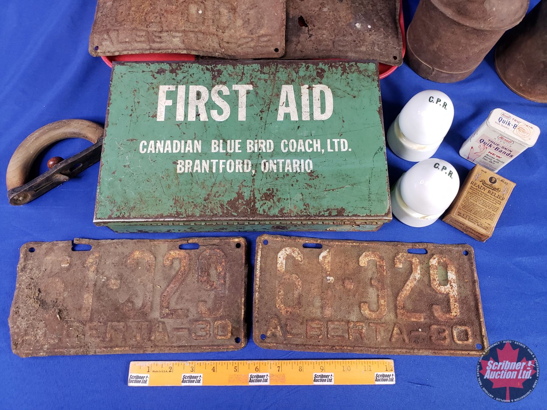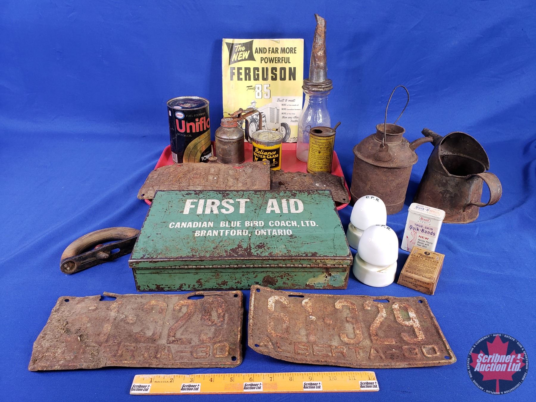 Collector Combo ~ Vintage Garage : 1930 Alberta Lic Plate Pair; Ferguson Manual; CPR Insulators; Oil Jug; Reliance Water Glass; Oil Tin; First Aid Kit Box; Coleman Measuring Can; etc! (SEE PICS!)