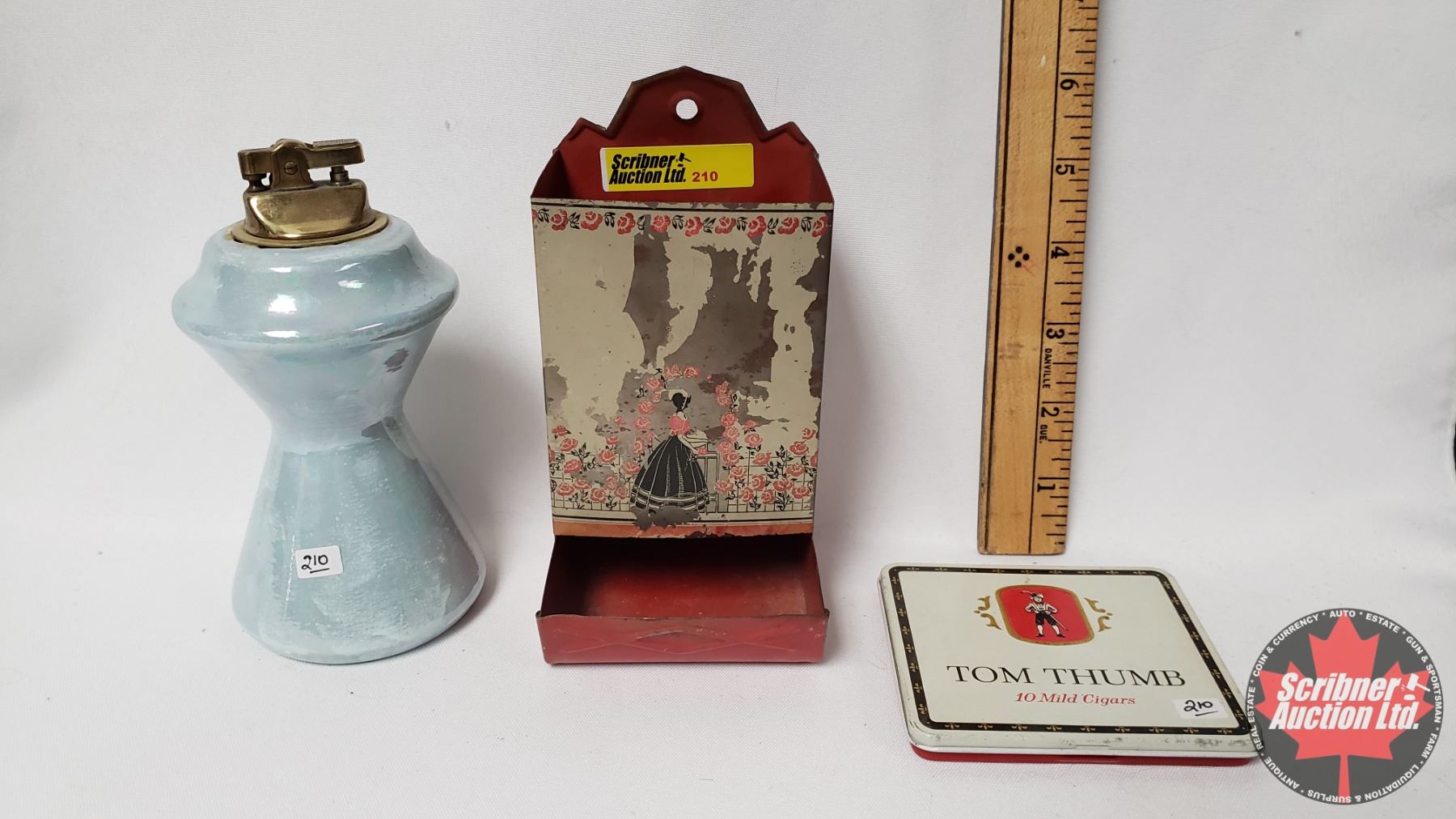 Collectors Combo (3) : Tom Thumb 10 Mild Cigars Tin & Match Stick Box Holder/Dispenser & Vintage Desk Top Ceramic Lighter