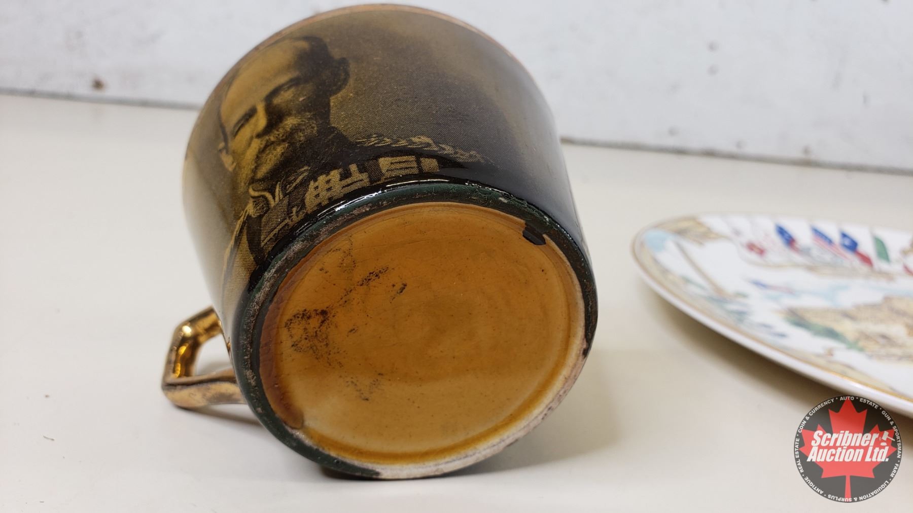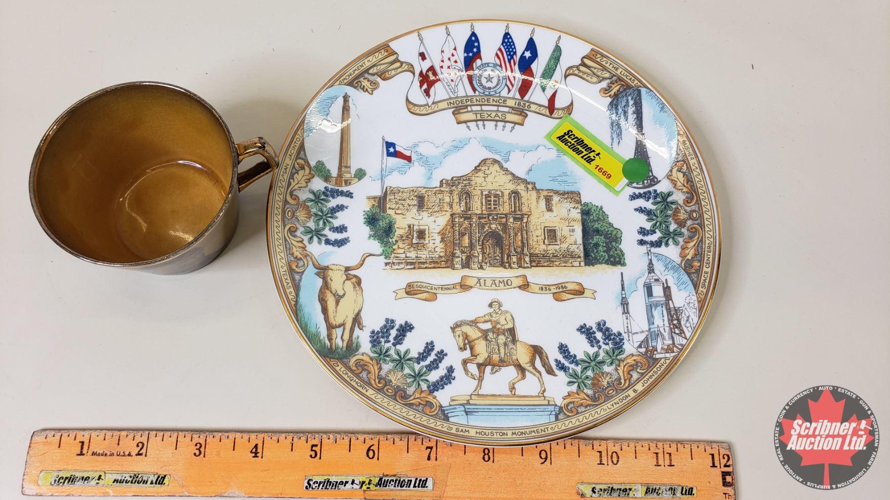 Combo: Antique Ridgeways Sepia Coffee Cup With Military Portraits & "The Texas Plate" (8-1/2"Dia) (SEE PICS!)