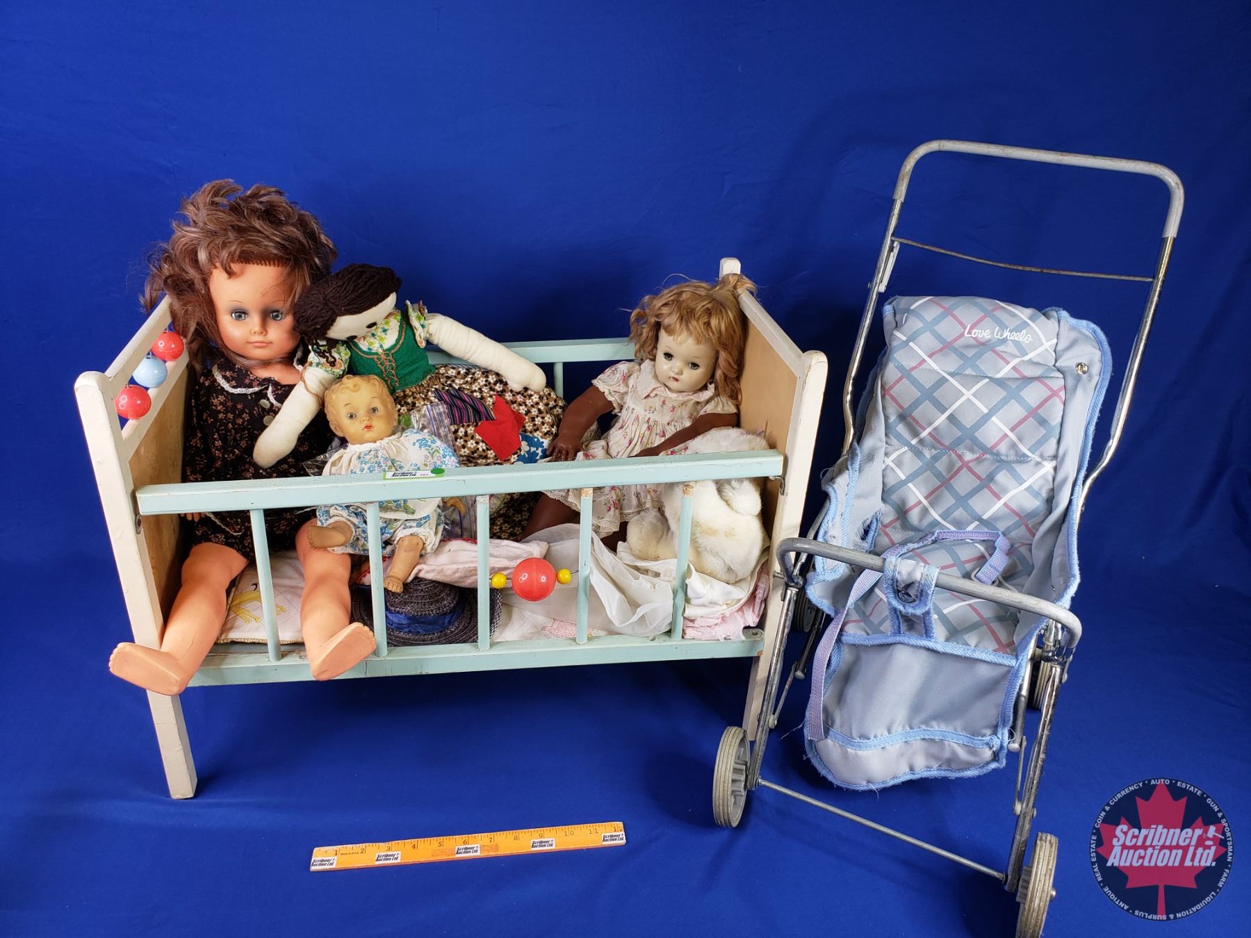 Combo: Dolls (5), Toy Crib & Toy Stroller (Crib Measures: 19"H x 25-1/2"W x 12-3/4"D) (SEE PICS!)