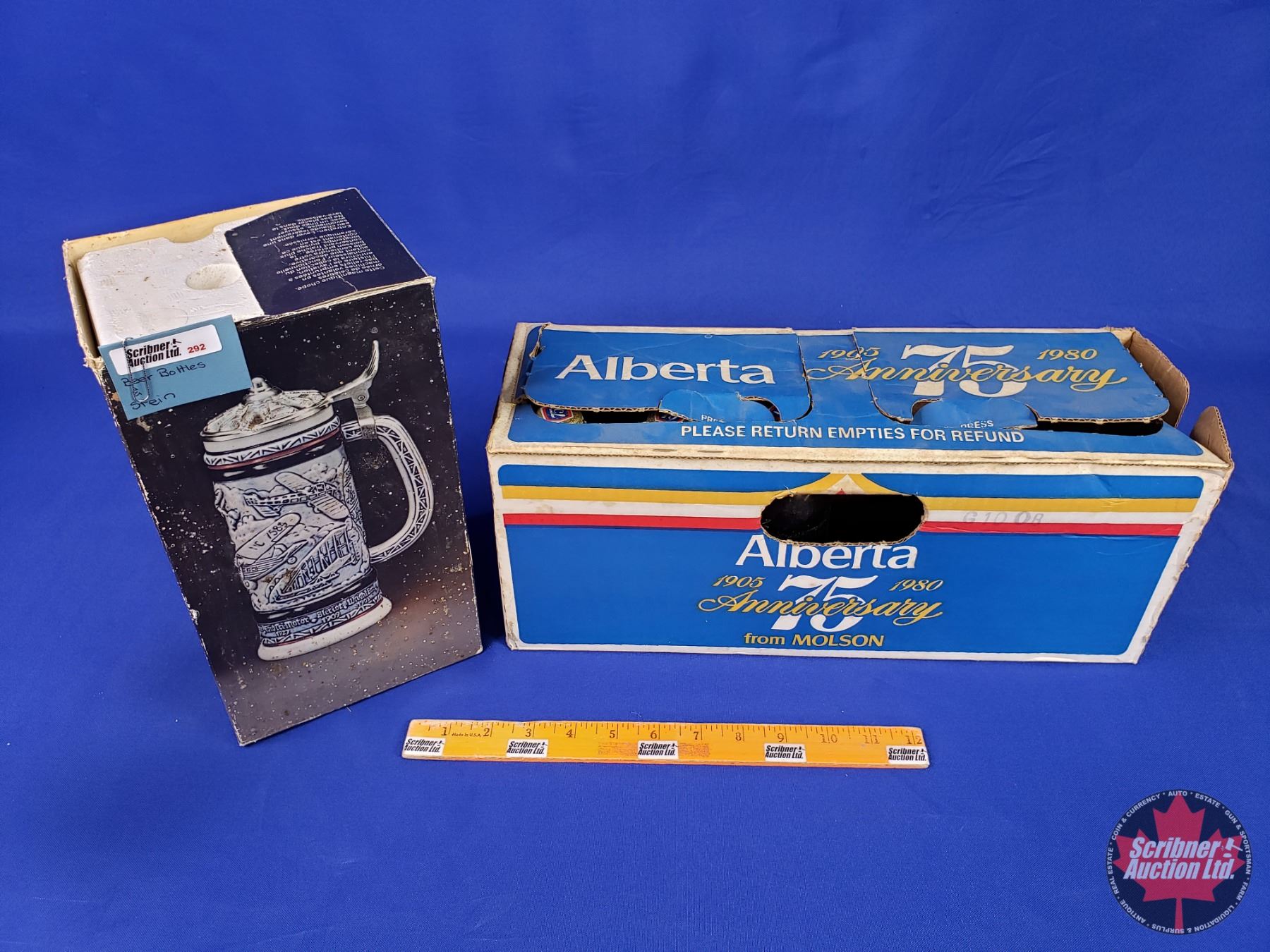 Combo: Flying Classics Beer Stein & Alberta 75th Anniversary 1980 Molson Beer Case w/6 Bottles (Stein Box Measures: 10-1/2"H x 5-1/4"W x 6-1/4"D) (SEE PICS!)