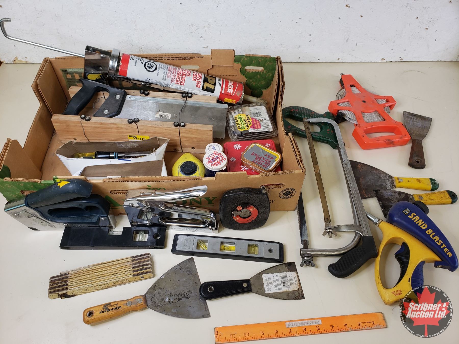 Combo Tool Lot: Hand Saws; Putty Knives; Level; Tape Measure; Mitre Saw; Staple Guns; etc! (SEE PICS!)