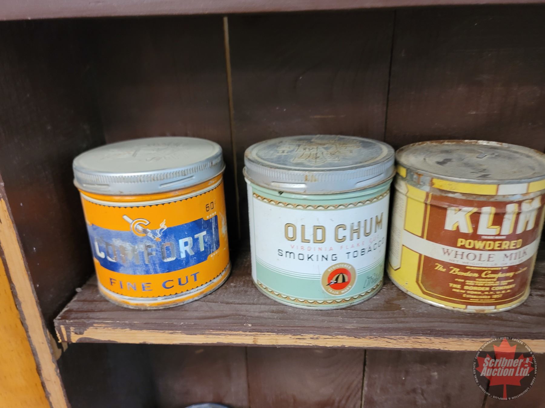 Confectionery & Tobacco Tins (27) w/ Wooden Standing Shelf Unit