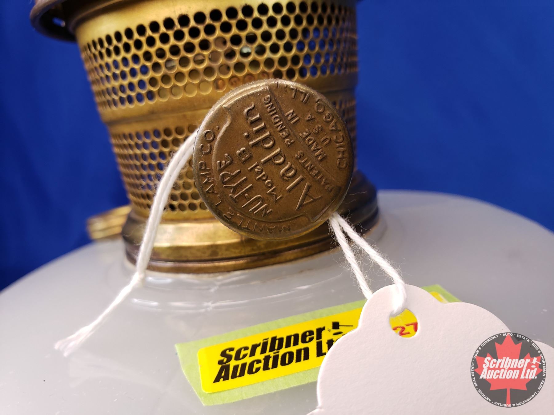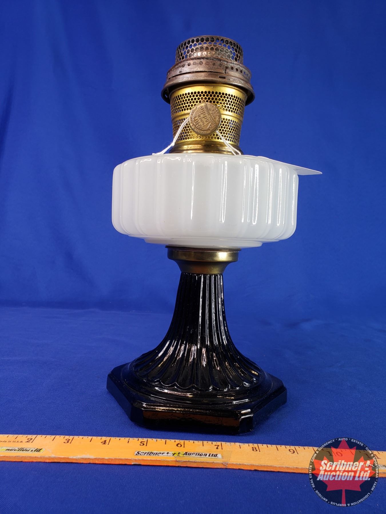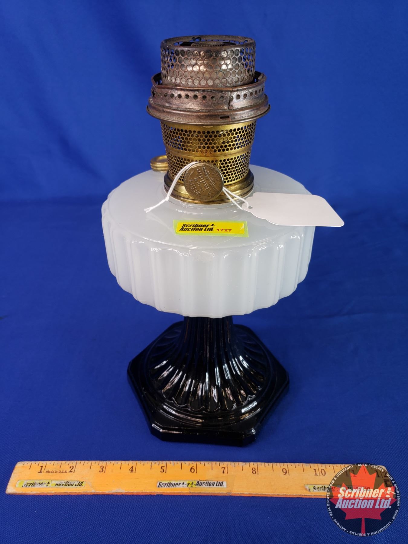 Corinthian Oil Lamp - Black Pedestal Base / White Font - Model B Aladdin Burner (No Chimney) (13"H) (SEE PICS!)