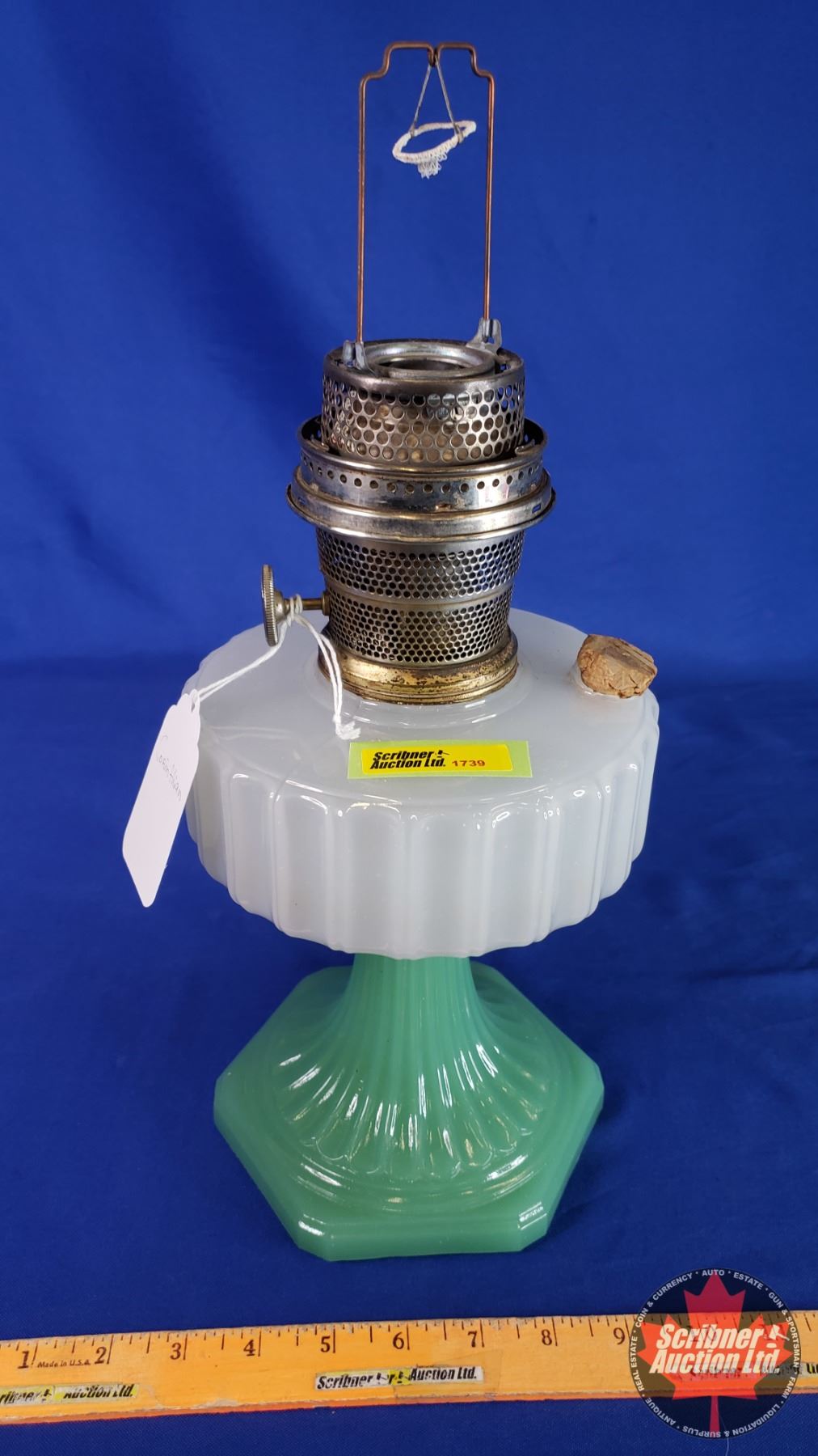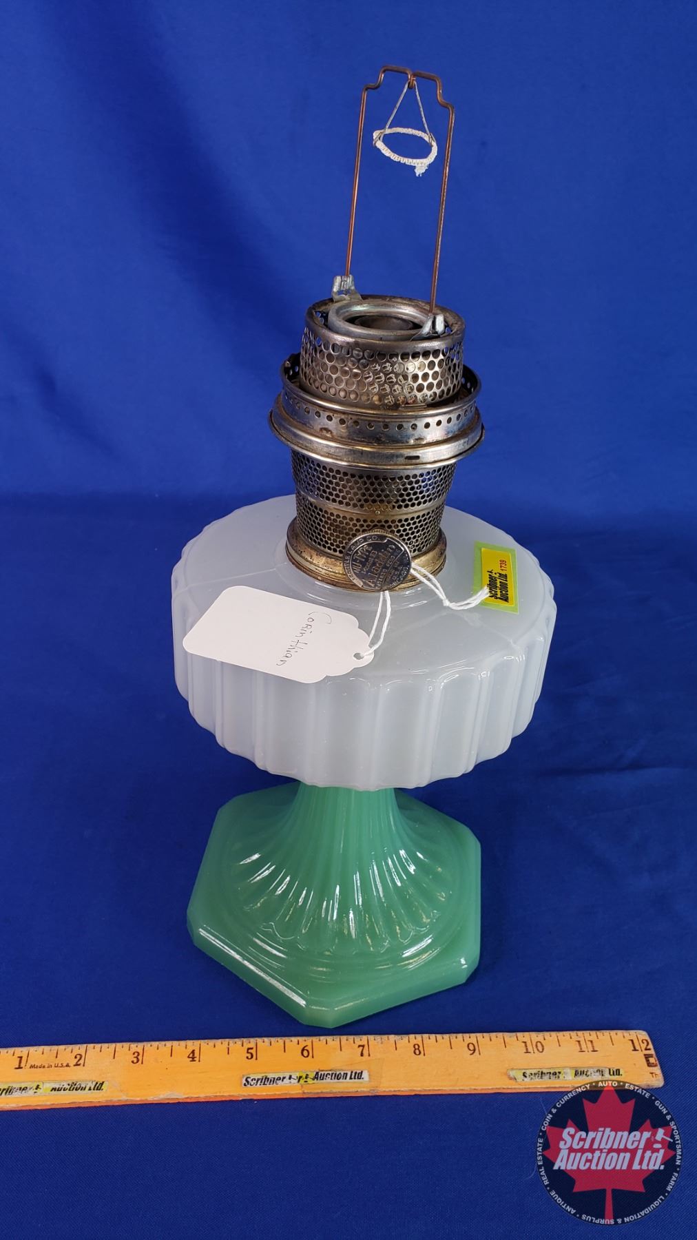 Corinthian Oil Lamp - Green Pedestal Base / White Font - Model B Aladdin Burner (No Chimney) (13"H) (SEE PICS!)