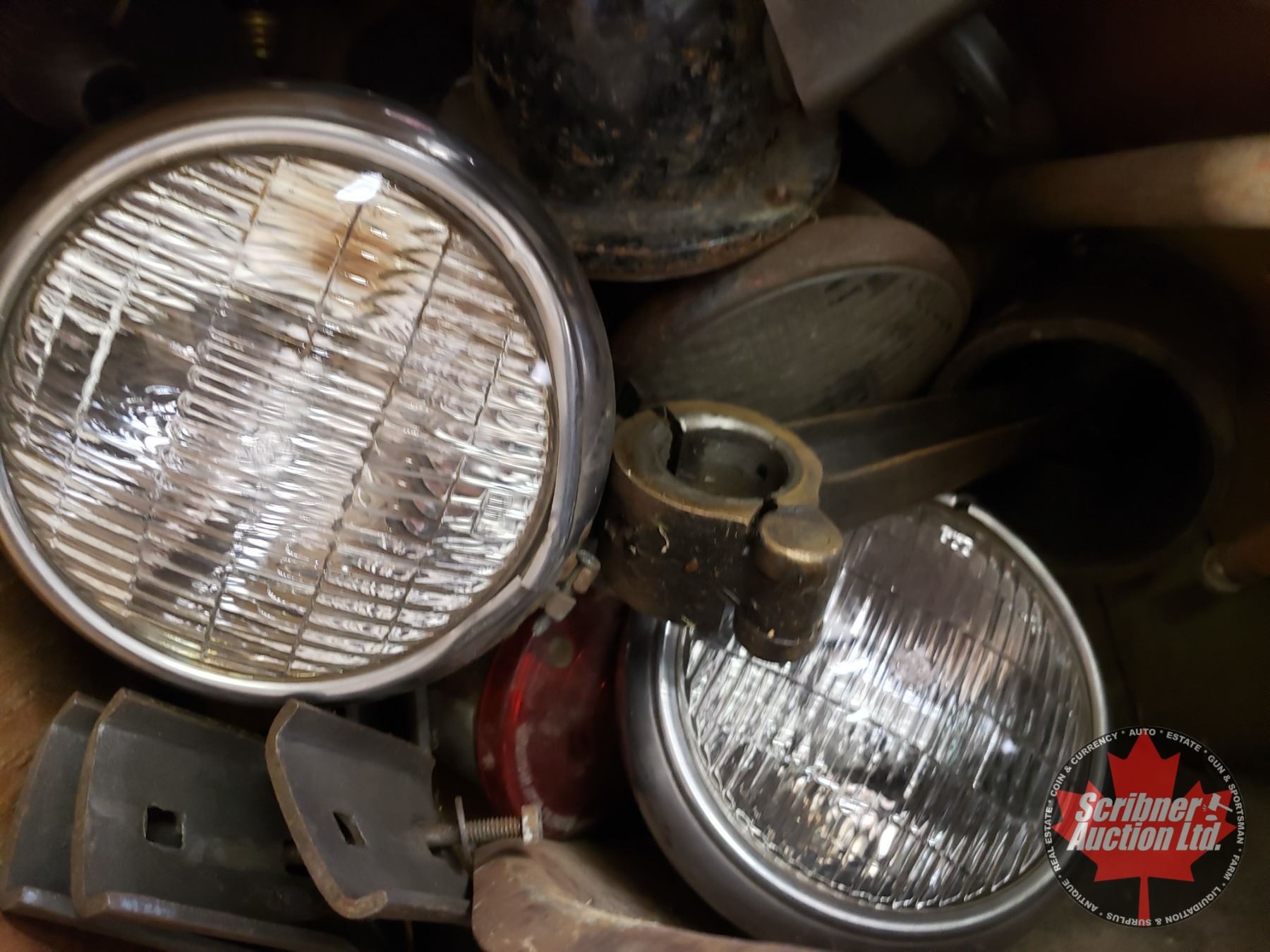 Crate Lot - Vintage & Shop Project Supply Items : Lights, Car Radios, Implement Seat, Old Car Horn, Gears, Old North Star Pail, Building Jack, etc (See Pics!) (42" x 42")