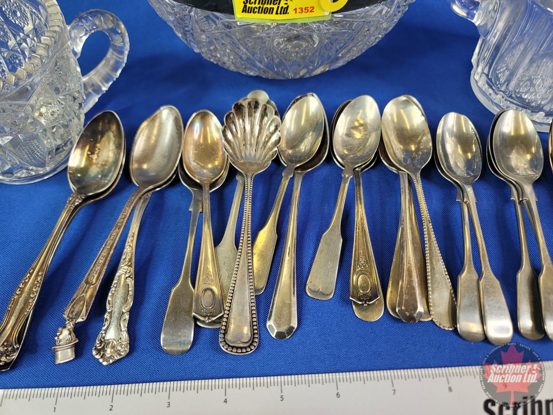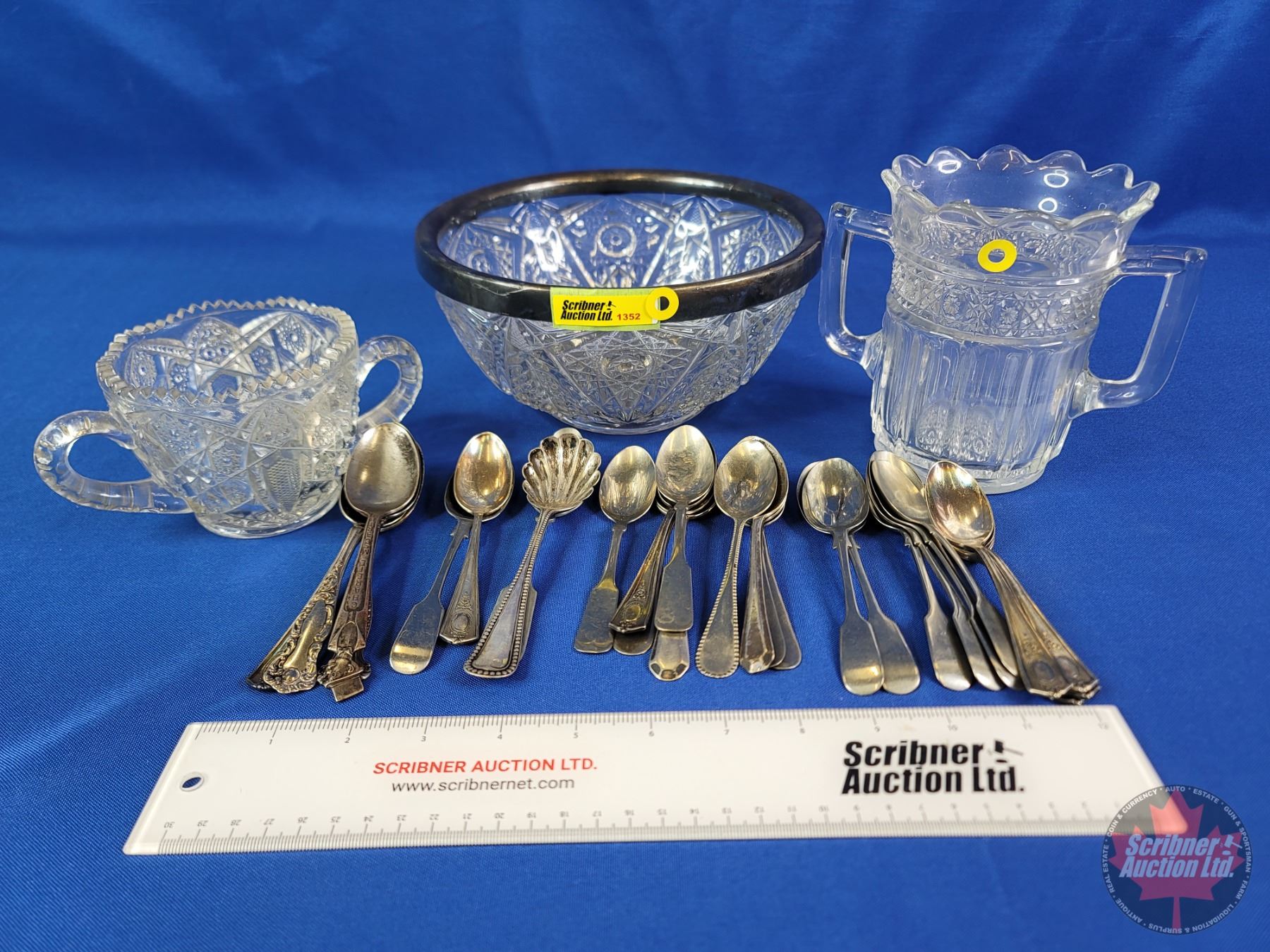 Cut Glass Serving Bowl; Silverware & Double Handle Cut Glass Pitchers (SEE PICS!)