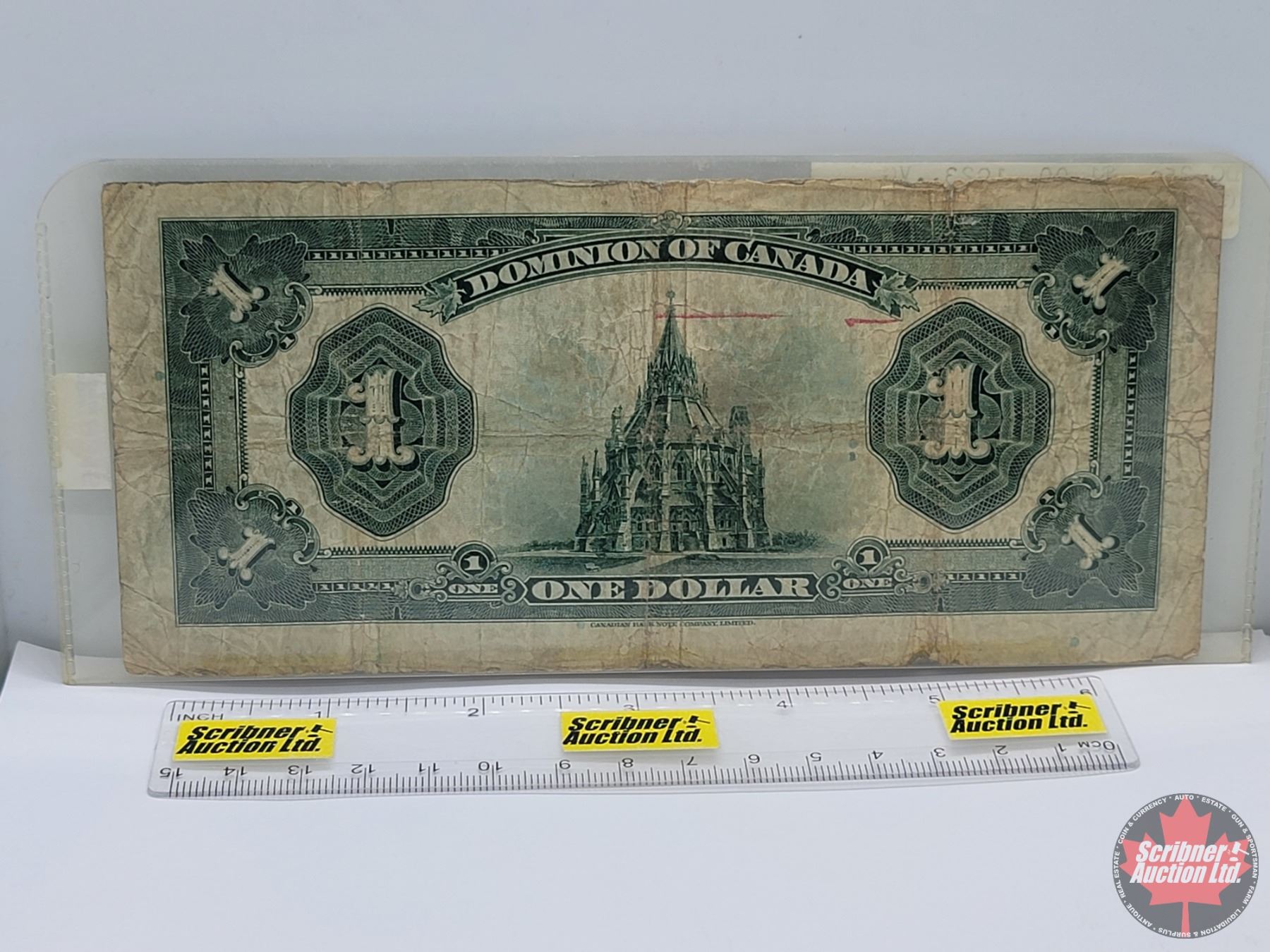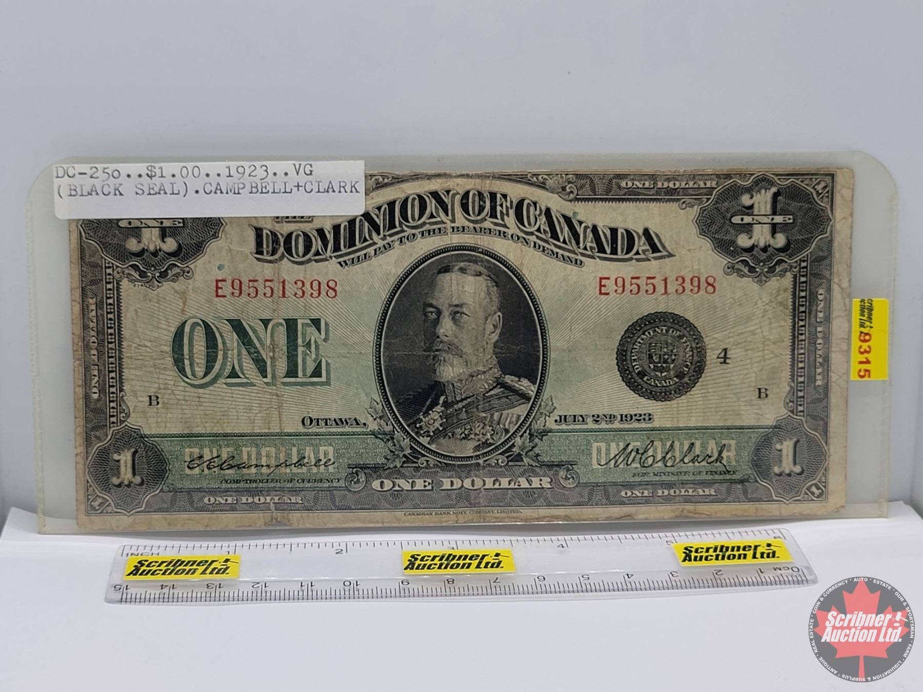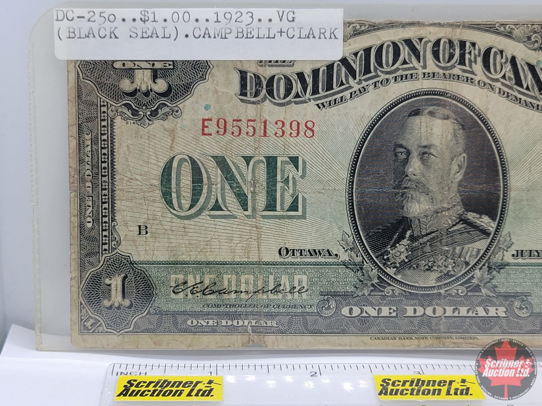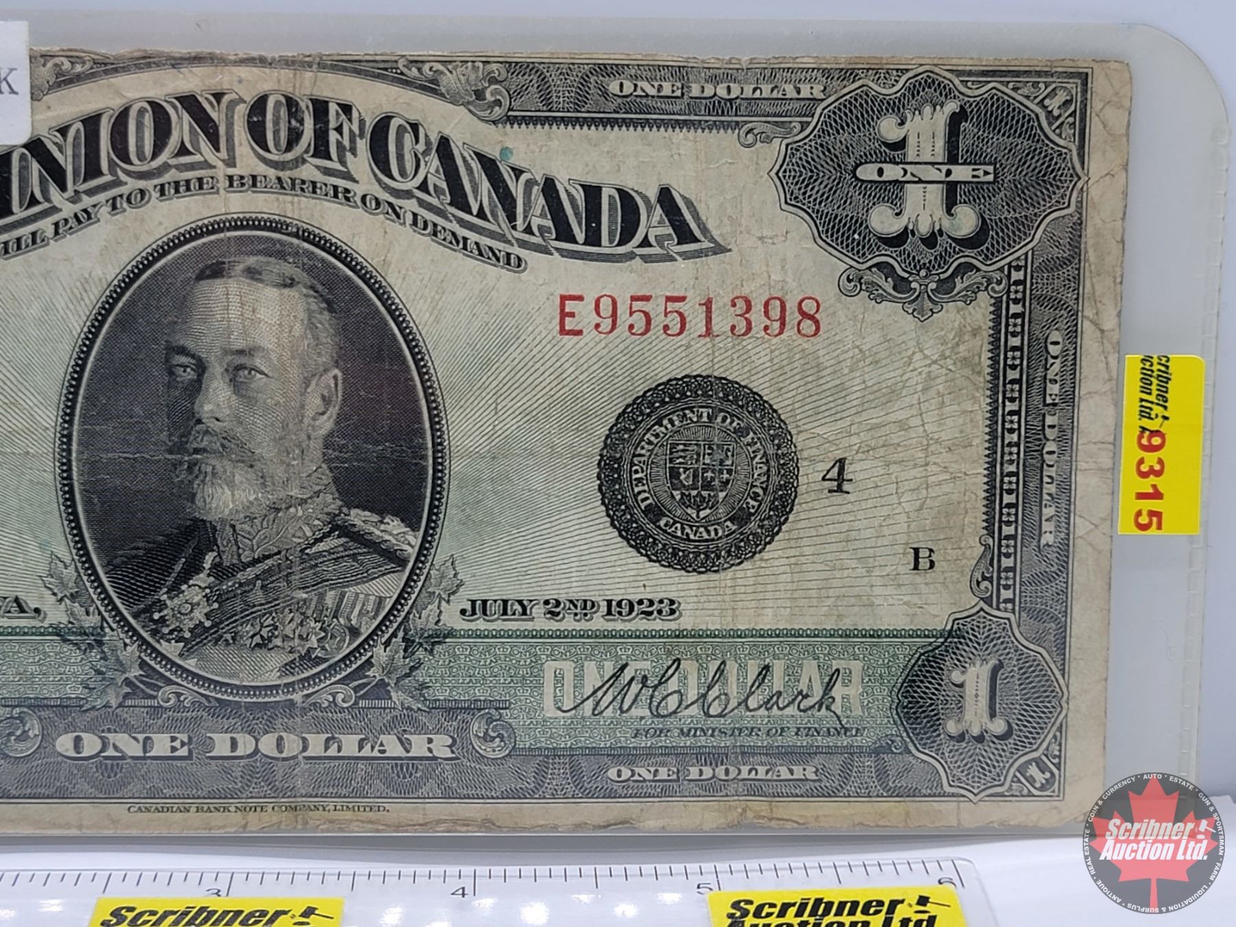 Dominion of Canada 1923 $1 Bill "Horse Blanket" : Campbell/Clark #E9551398 (See Pics for Serial Numbers, Signatures & Conditions)