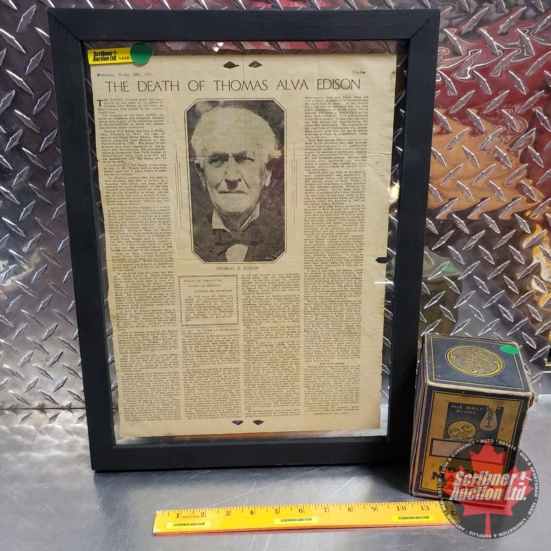 Double Sided Framed Family Herald / Weekly Star Newspaper Article "The Death of Thomas Alva Edison" from 1931 AND an Edison Mazda Lamps Lightbulb Box (See Pics) (Frame = 19"H x 14-1/4"W)