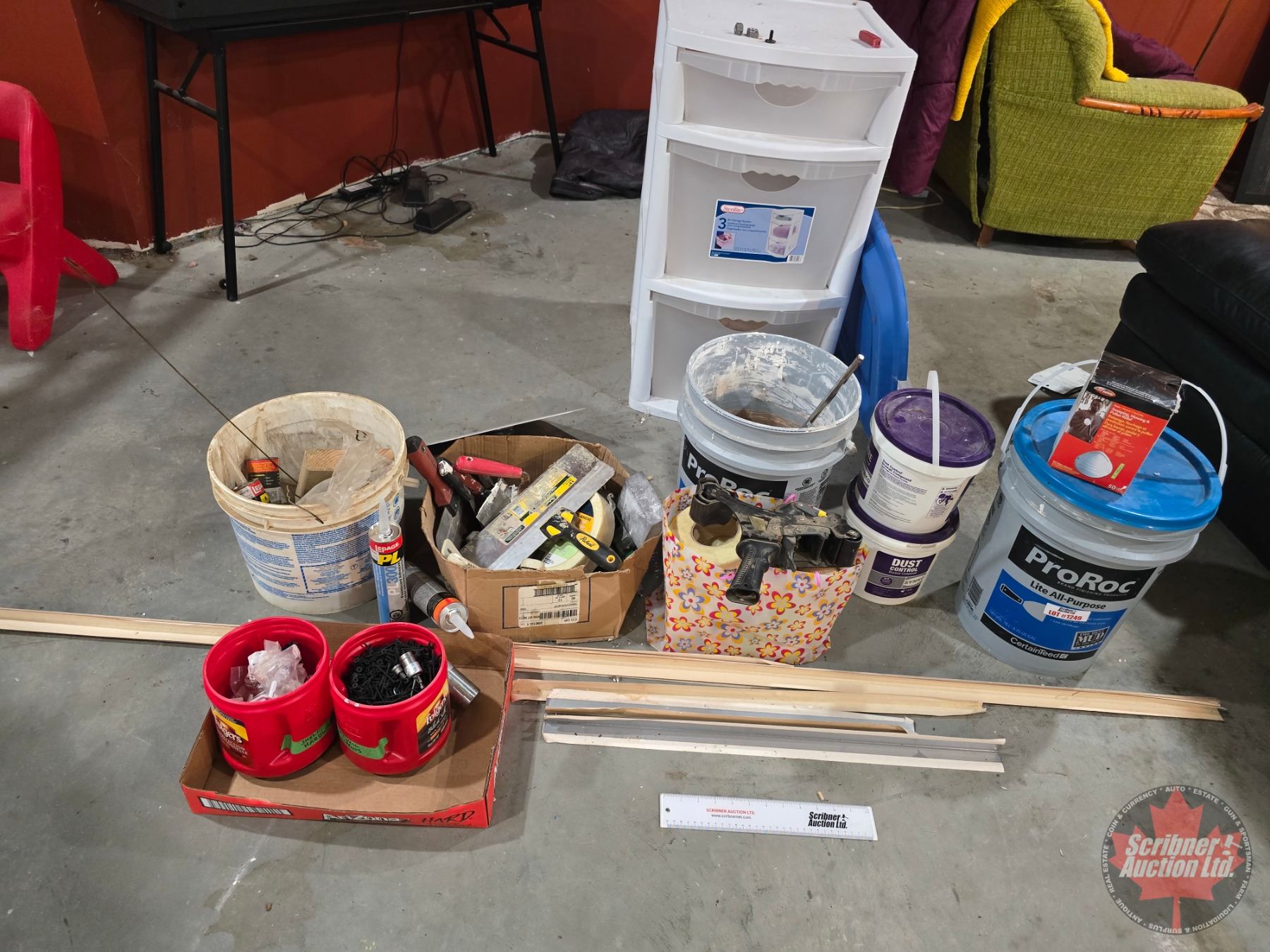 Drywall & Construction Supplies : Drywall Compound (Small Pail is Full & Large Pail is Partial), Drywall Tape & Tape Gun, Taping Knives, Drywall Screws & Corners, etc