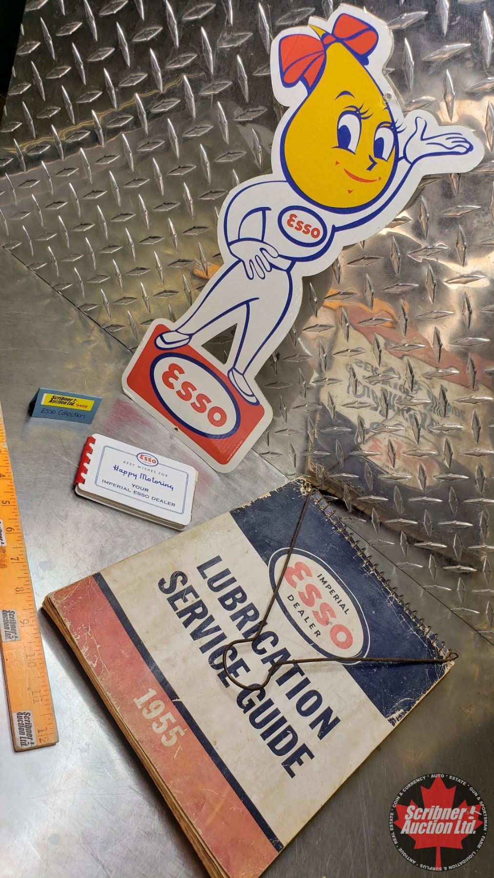 ESSO Collector Combo : 1955 Lubrication Service Guide, Cardboard Display Sign & 1930's Motor Vehicle Permit and Identification (SEE PICS!)