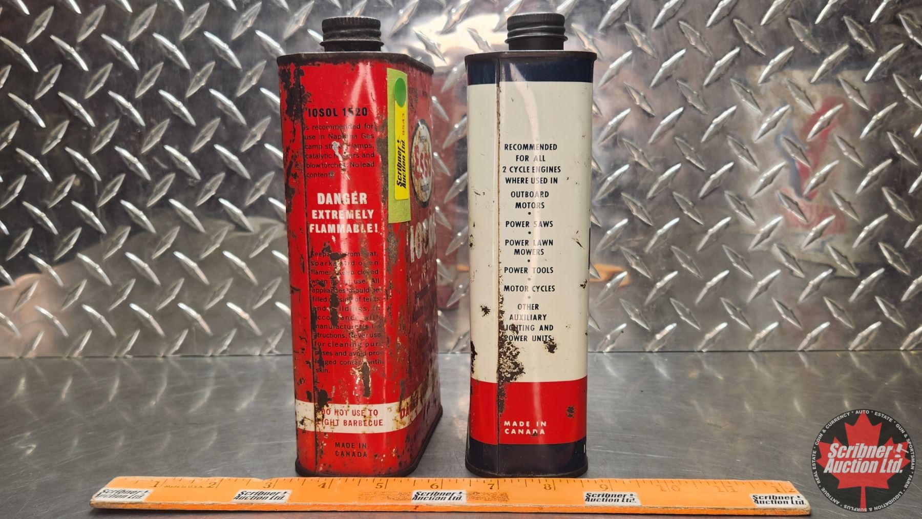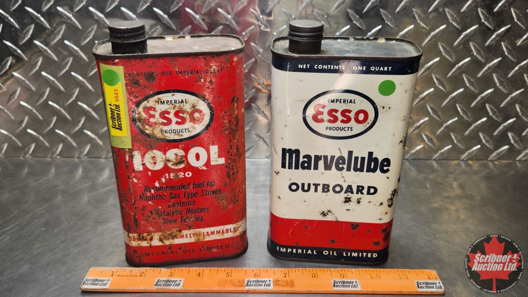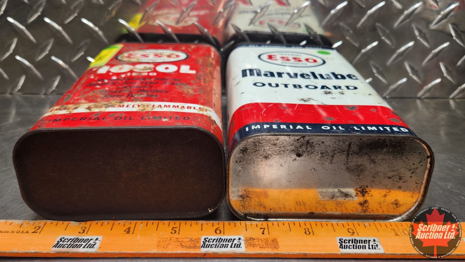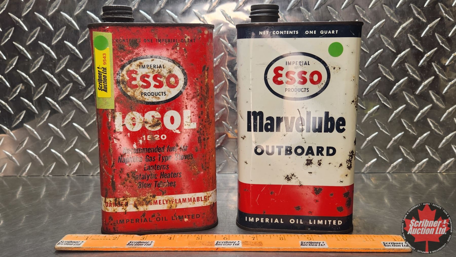ESSO OIL TINS (2) : IOSOL & Marvelube Outboard (8-1/2"H x 4-1/2"W x 2-1/2"D) (SEE PICS!)