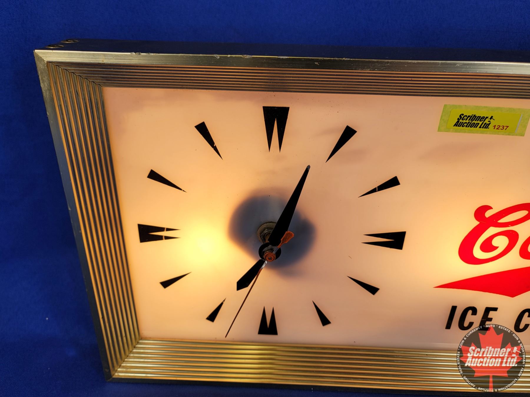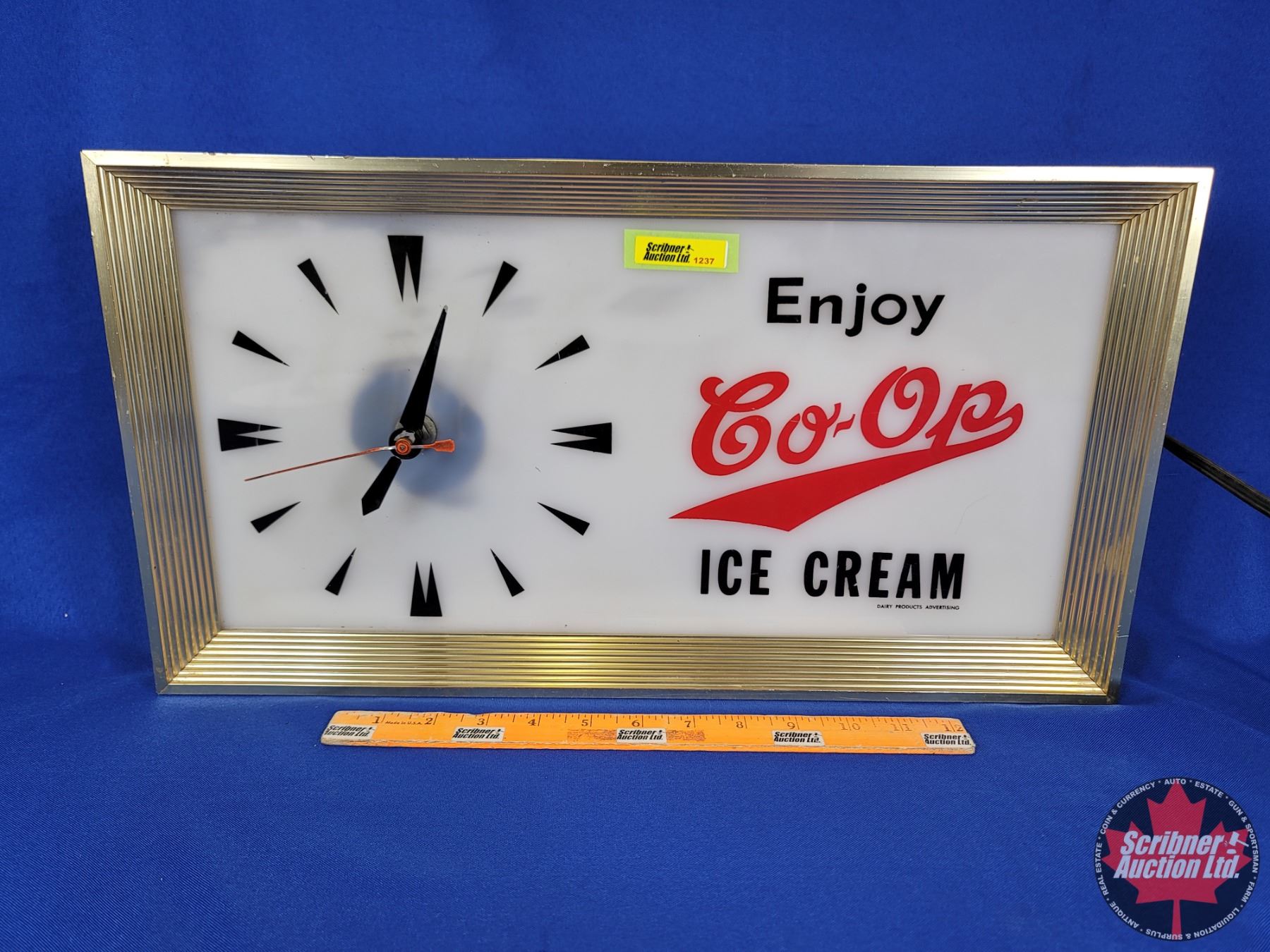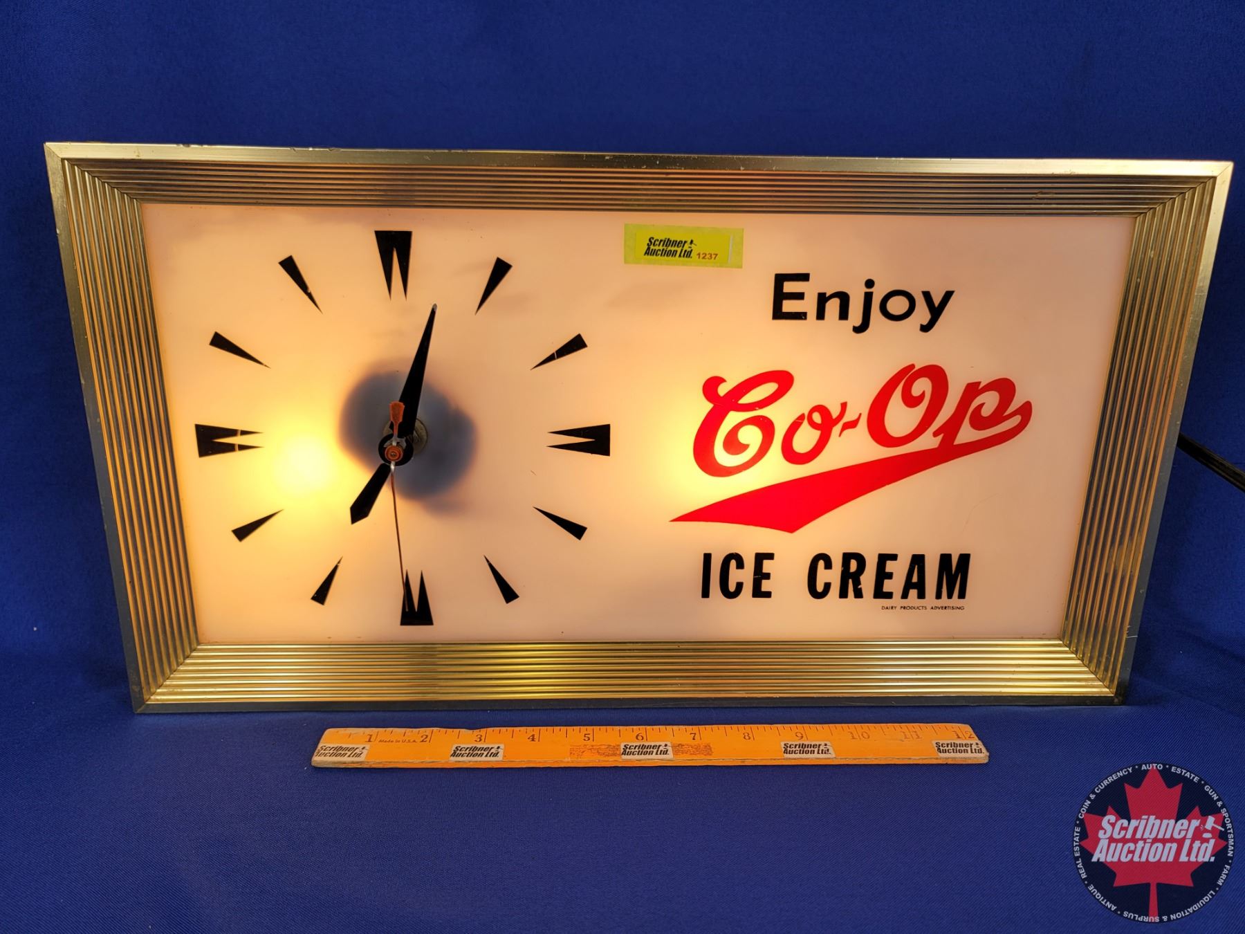 "Enjoy Co-Op Ice Cream" Lighted Advertising Clock (Working) (10-3/4"H x 19-3/4"W) (SEE PICS!)