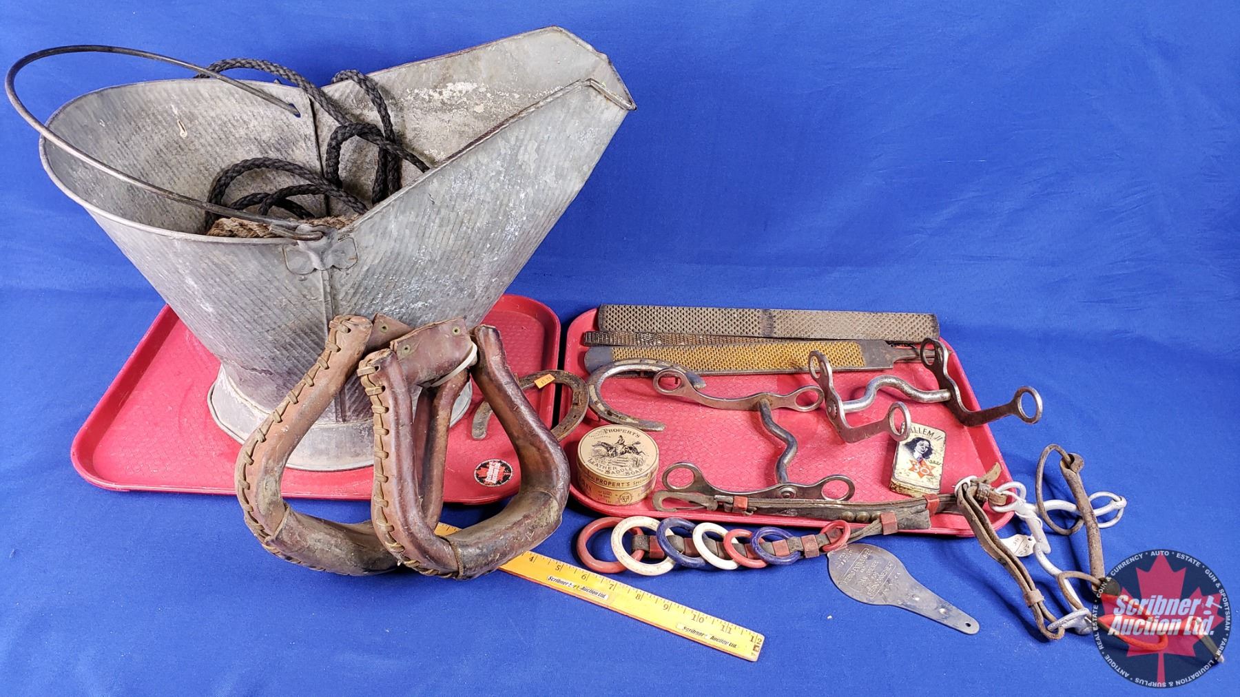Equestrian / Tack Grouping with Scuttle : Bits, Stirrups, Horse Shoes, Files, etc ! (Scuttle Measure