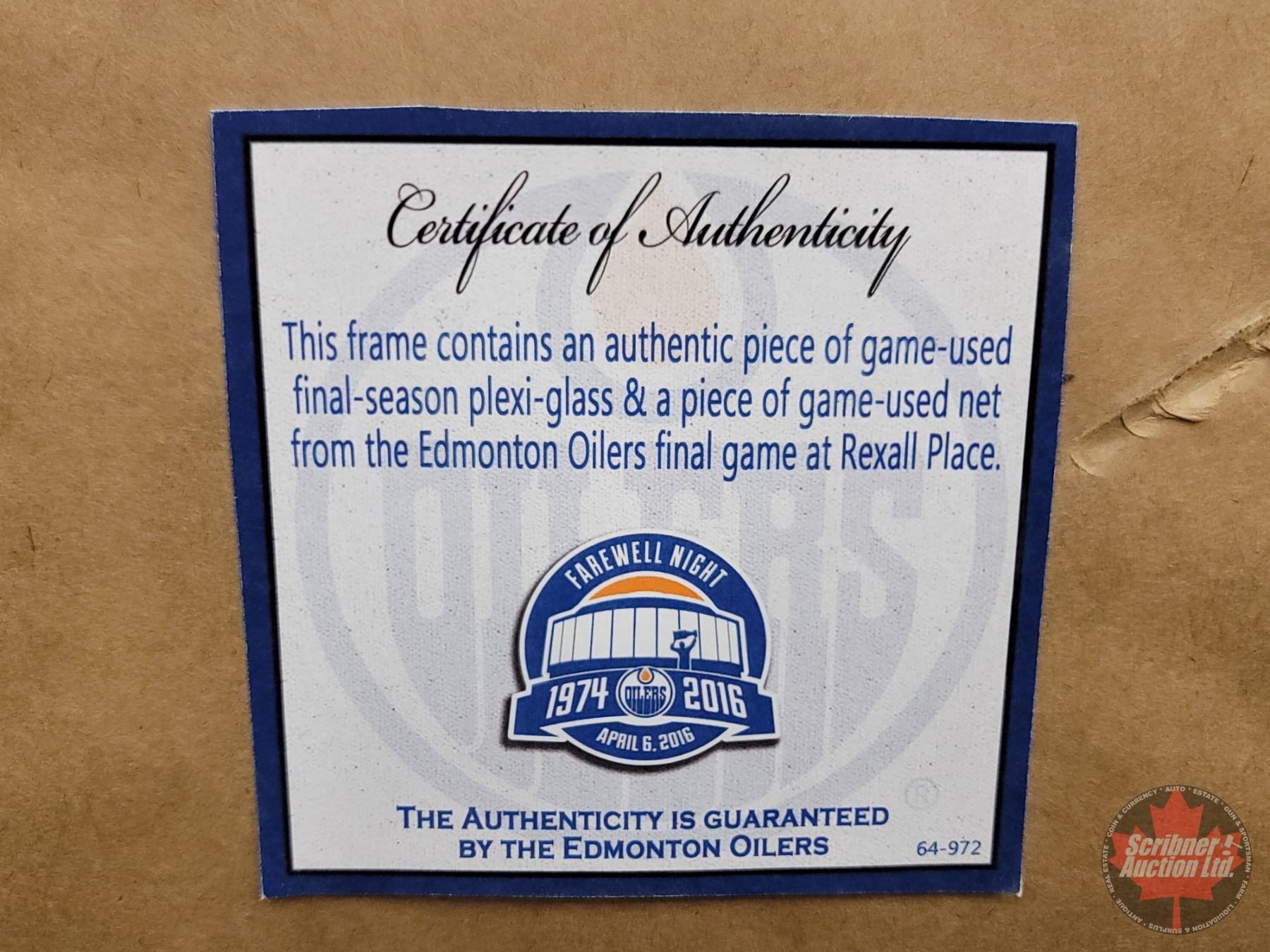 "The Authenticity is Guaranteed by the Edmonton Oilers 64-972"