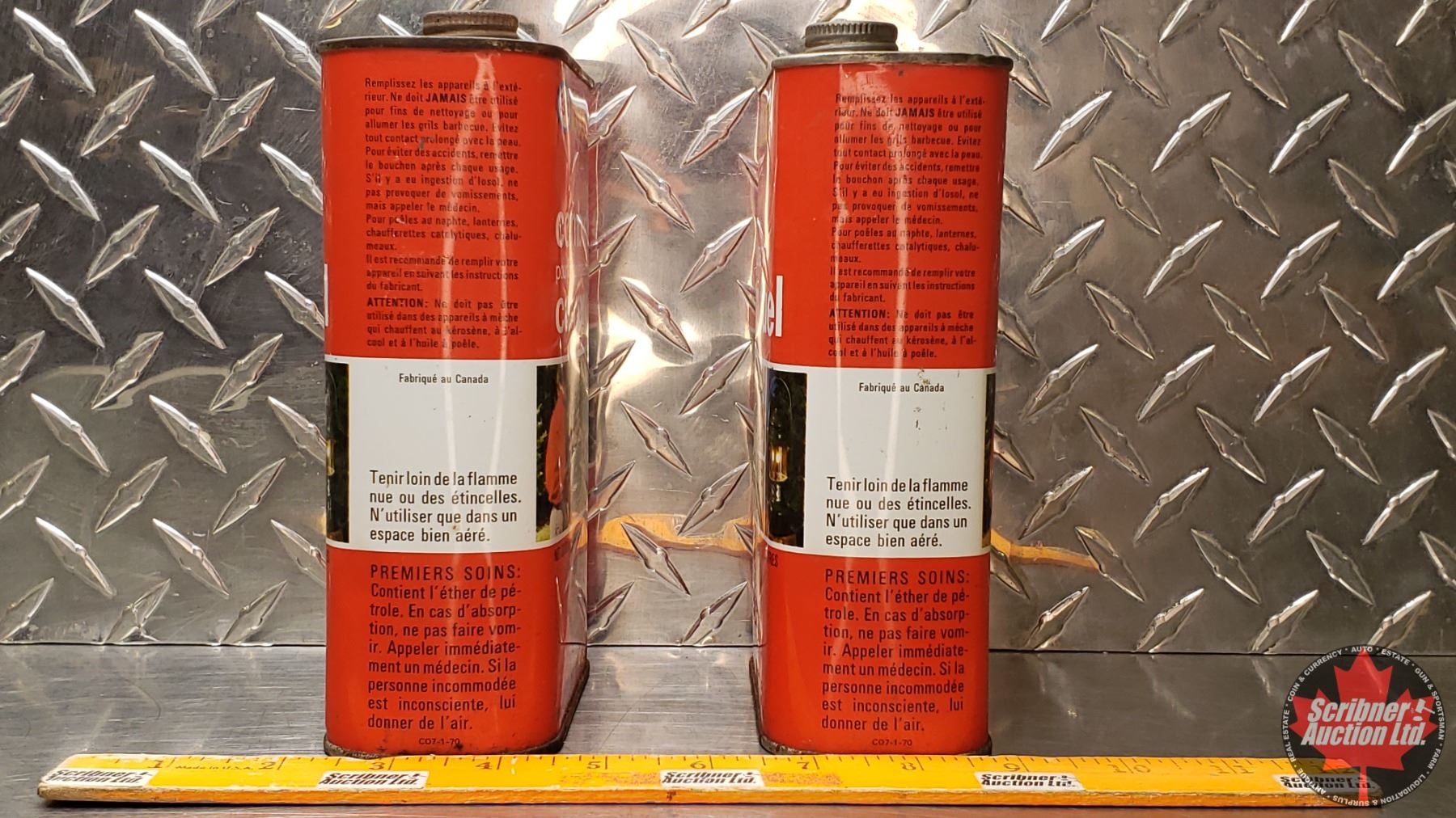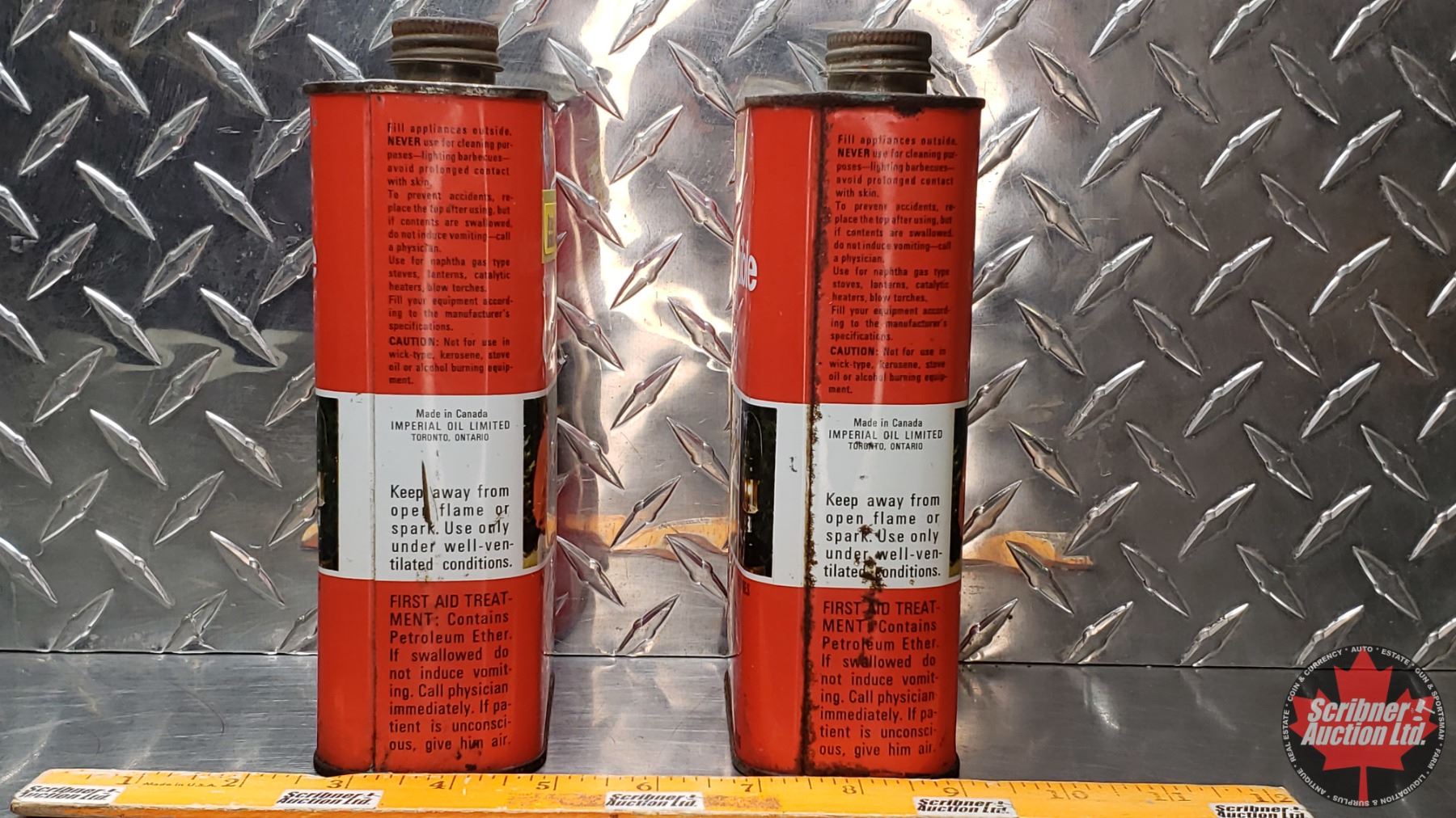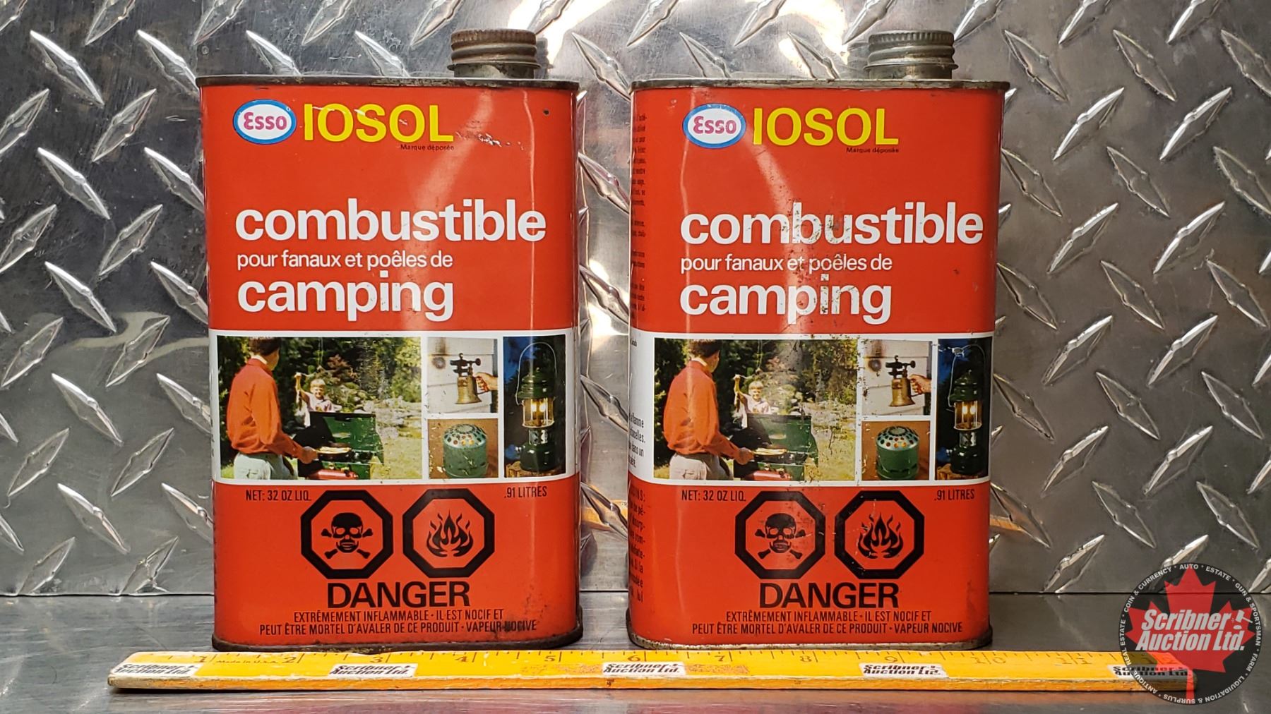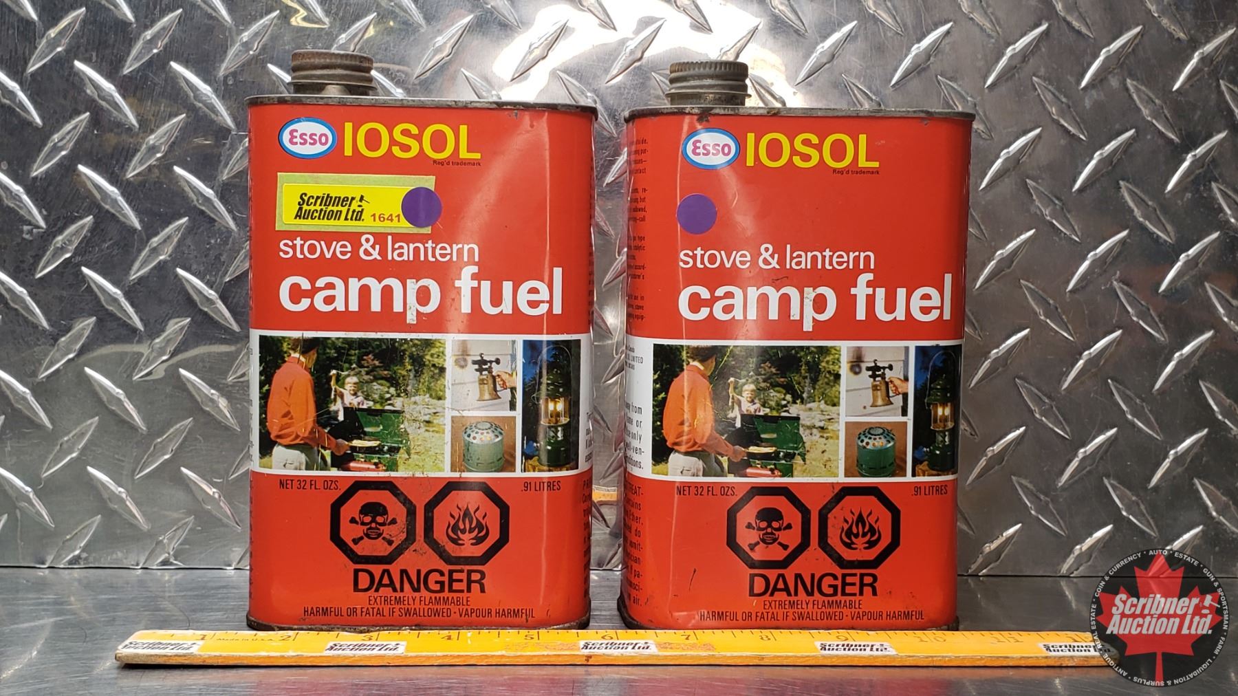 FUEL TINS (2): ESSO IOSOL STOVE & LANTERN CAMP FUEL (7-1/2"H X 4-1/2"W x 2-1/2"D) (SEE PICS!)