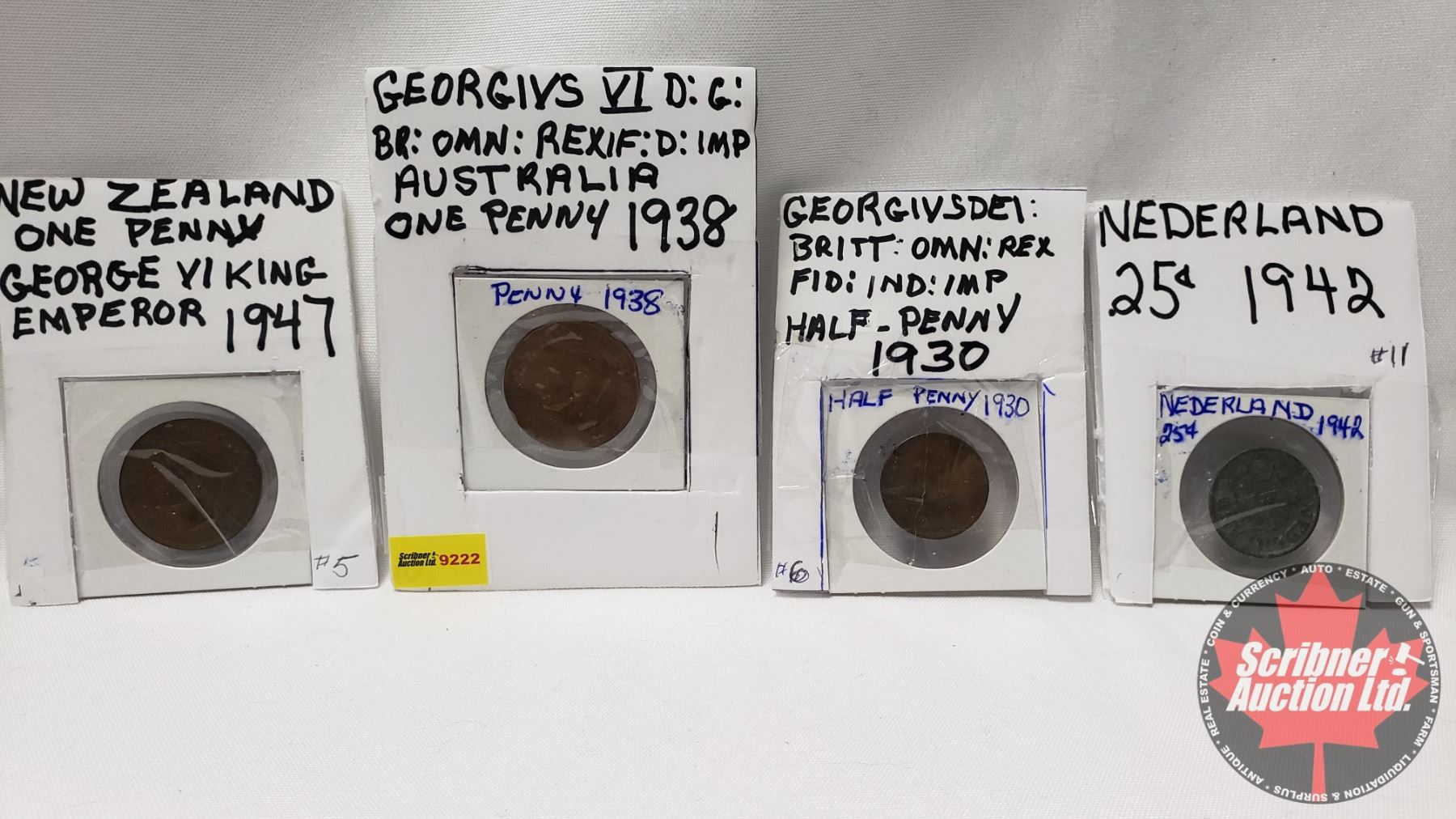 Foreign Coins (4): GB Half Penny 1930; Australia One Penny 1938; Nederland Twenty Five Cent 1942; New Zealand One Penny 1947