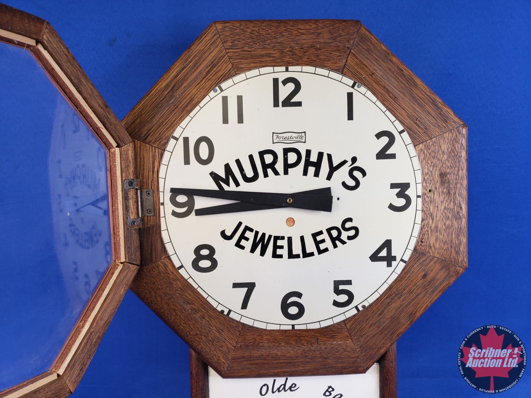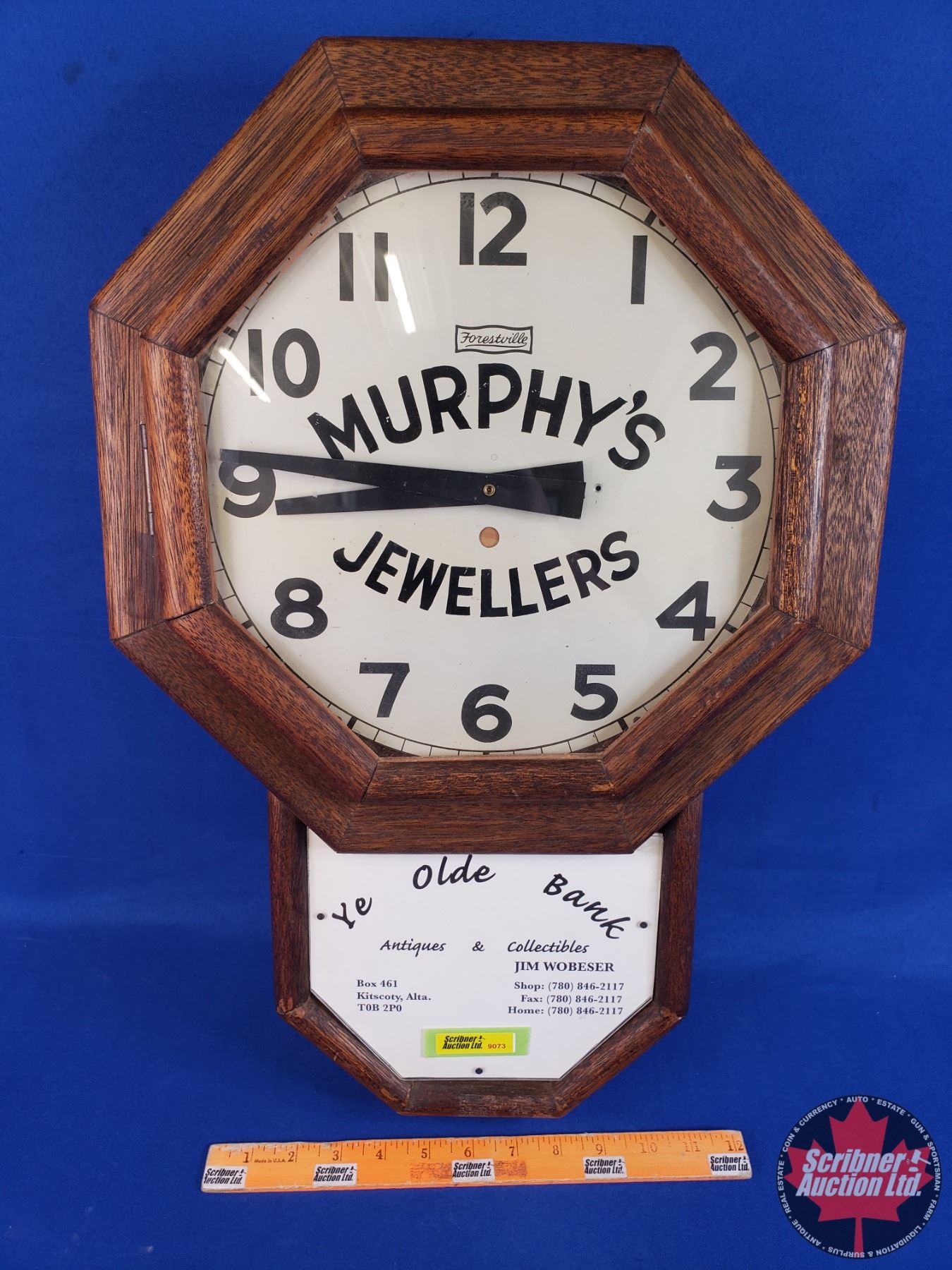 Forestville Wall Clock "MURPHY'S JEWELLERS" with Ad Insert "Ye Olde Bank Kitscoty" (Batt Op) (22"H x 15"W x 5"D) (SEE PICS!)