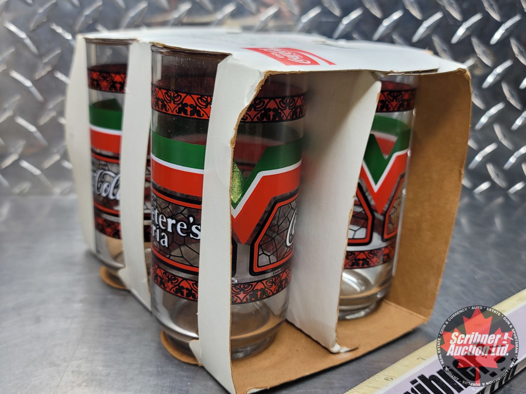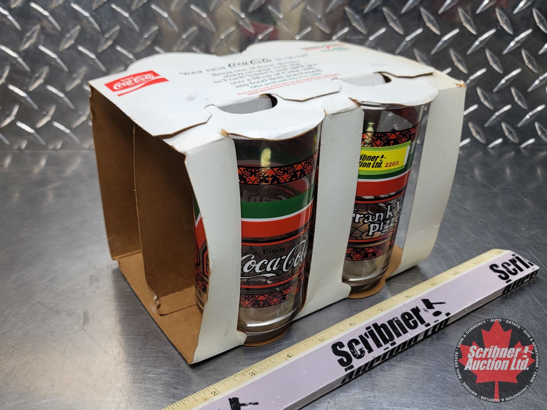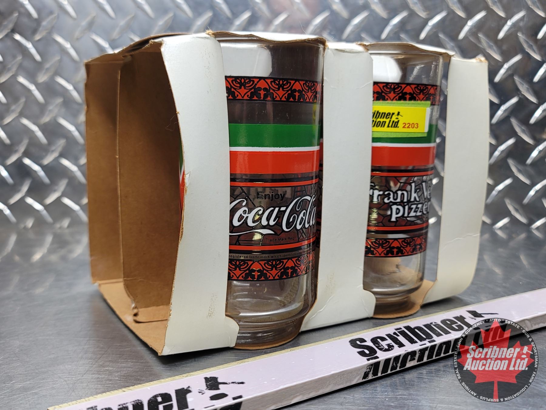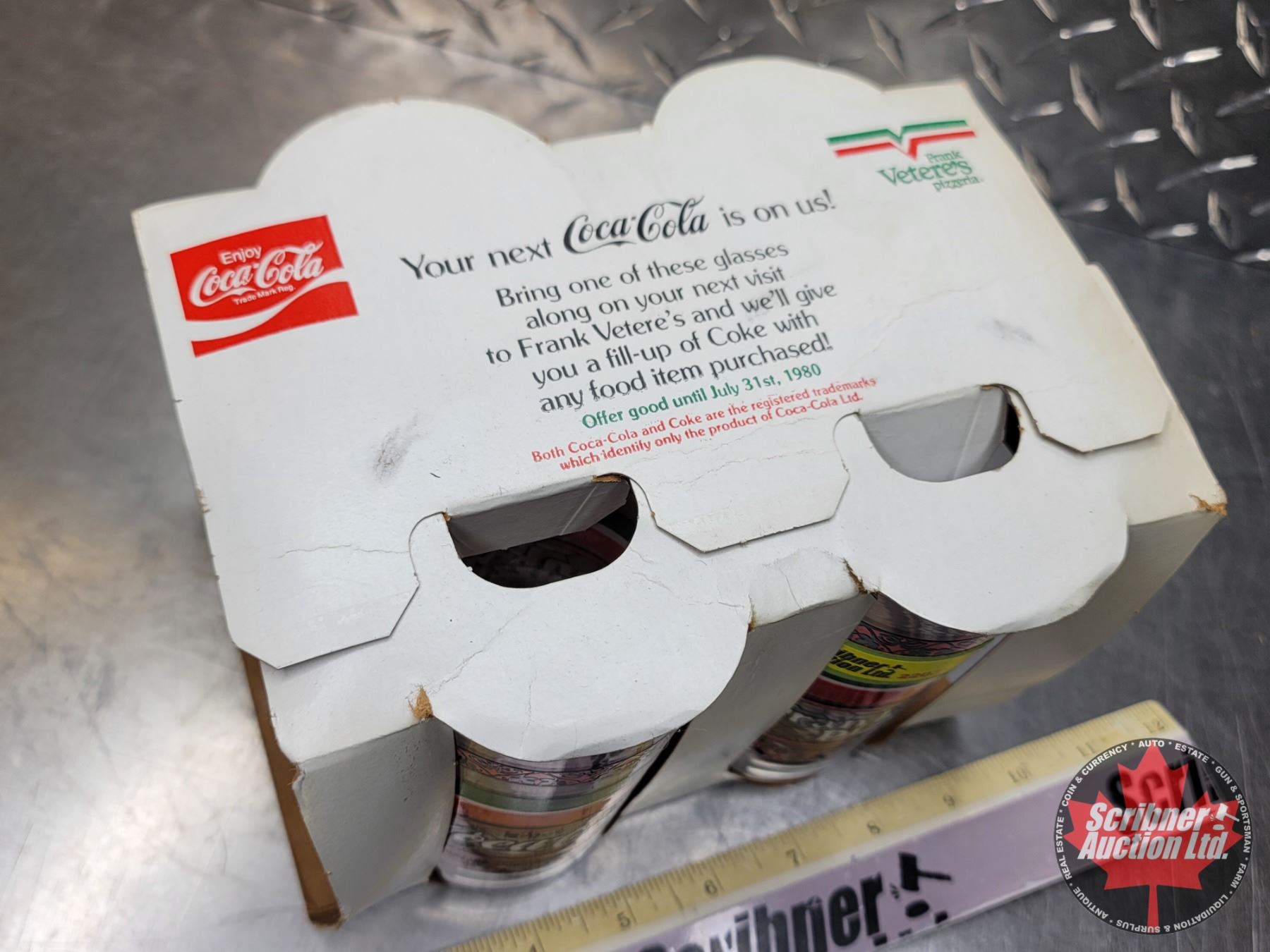 Frank Vetere's Pizzeria Promotional Coca-Cola Glasses : 4 Pack (NIB) (c.1980) (Pack Measures : 5-3/4"H x 9-1/4"W x 6"D) (SEE PICS!)