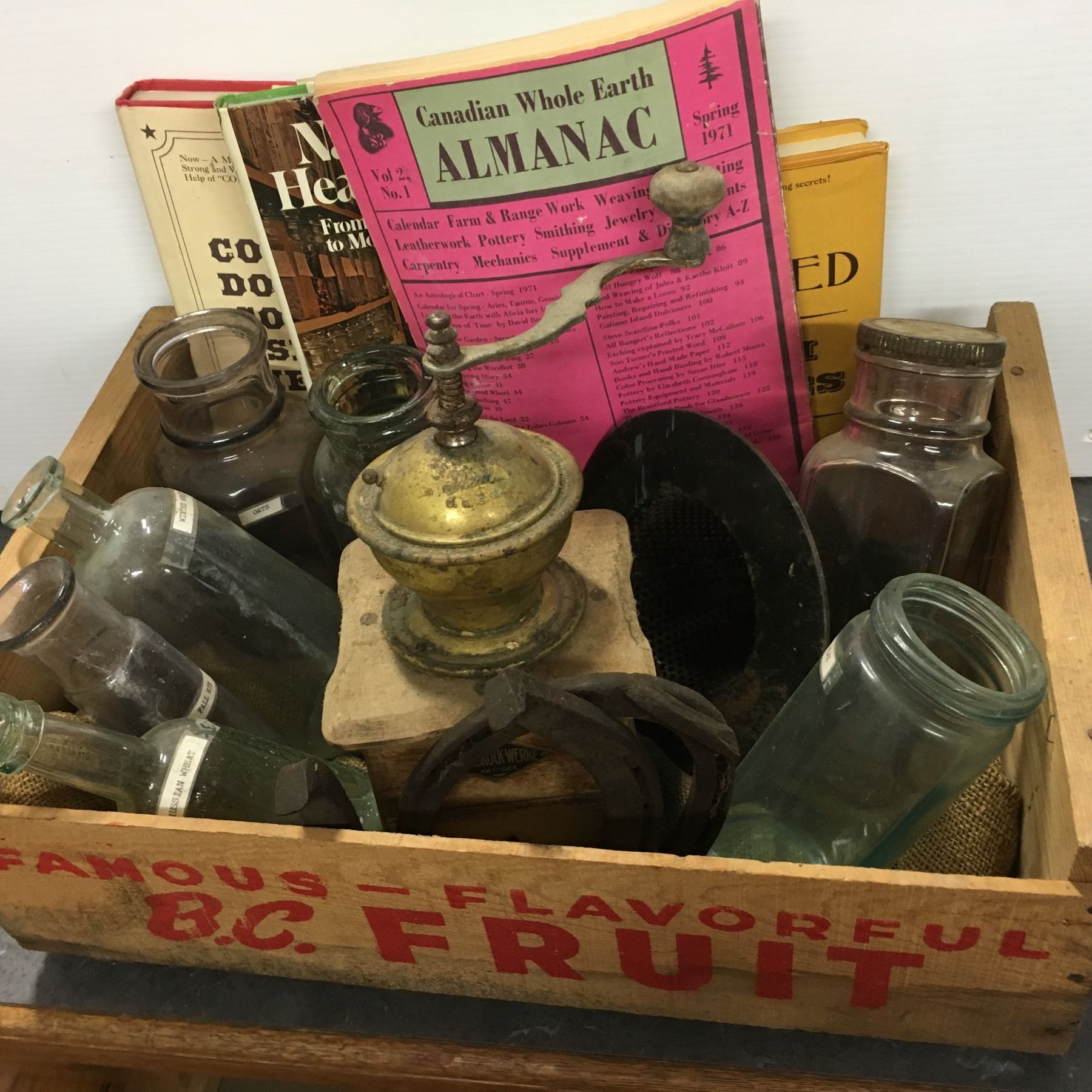 Fruit Crate w/Bottles, Coffee Grinder, Horse Shoes, Almanac, etc