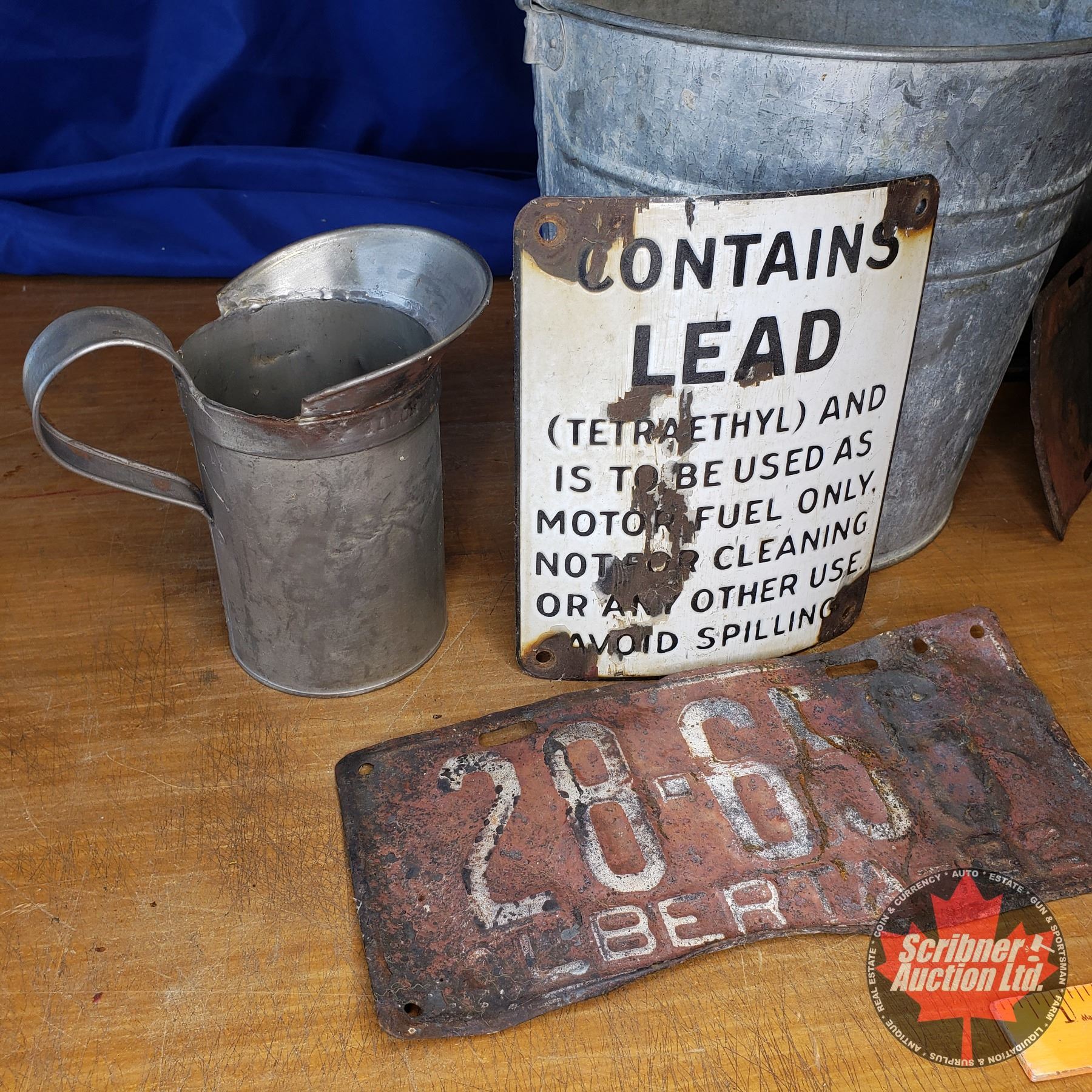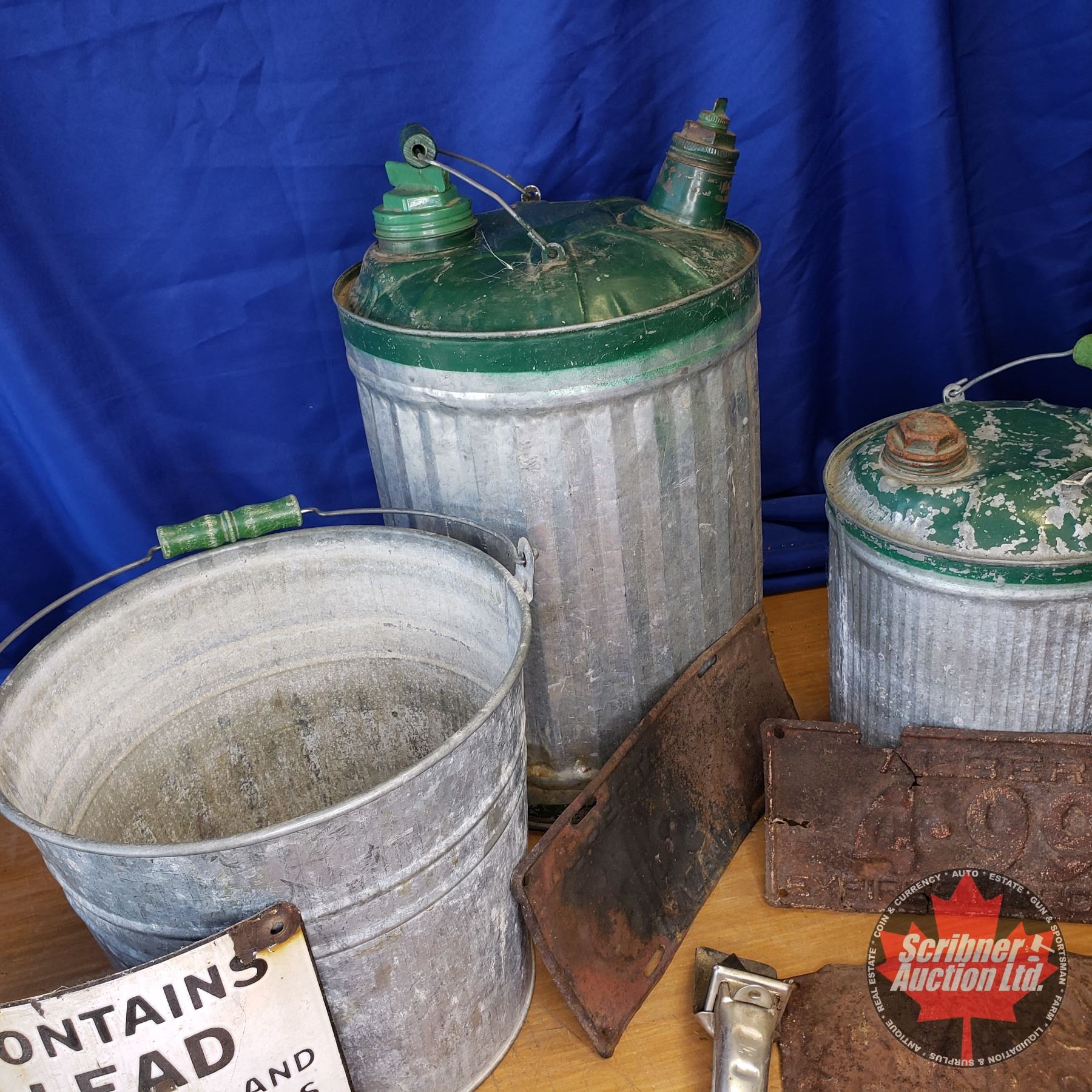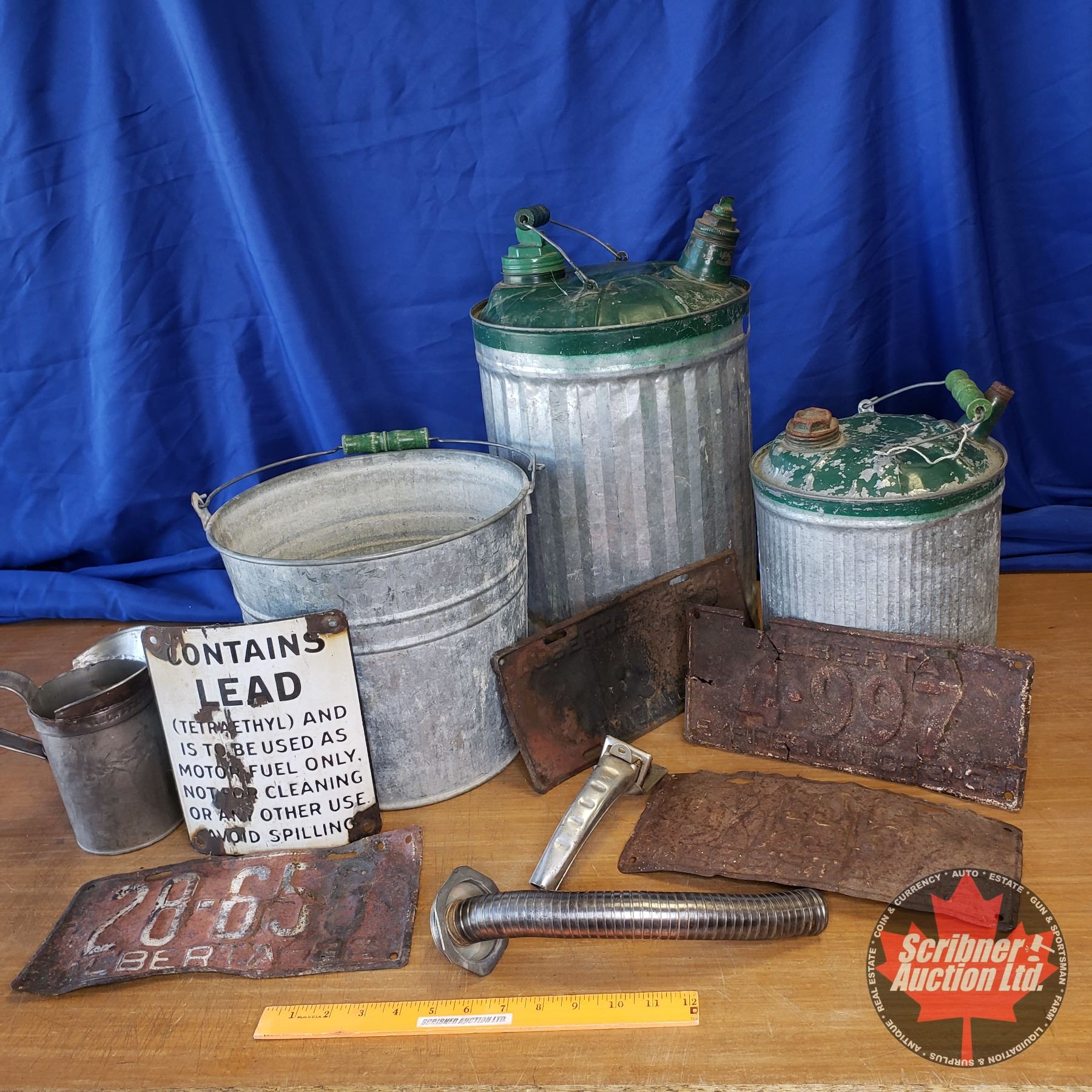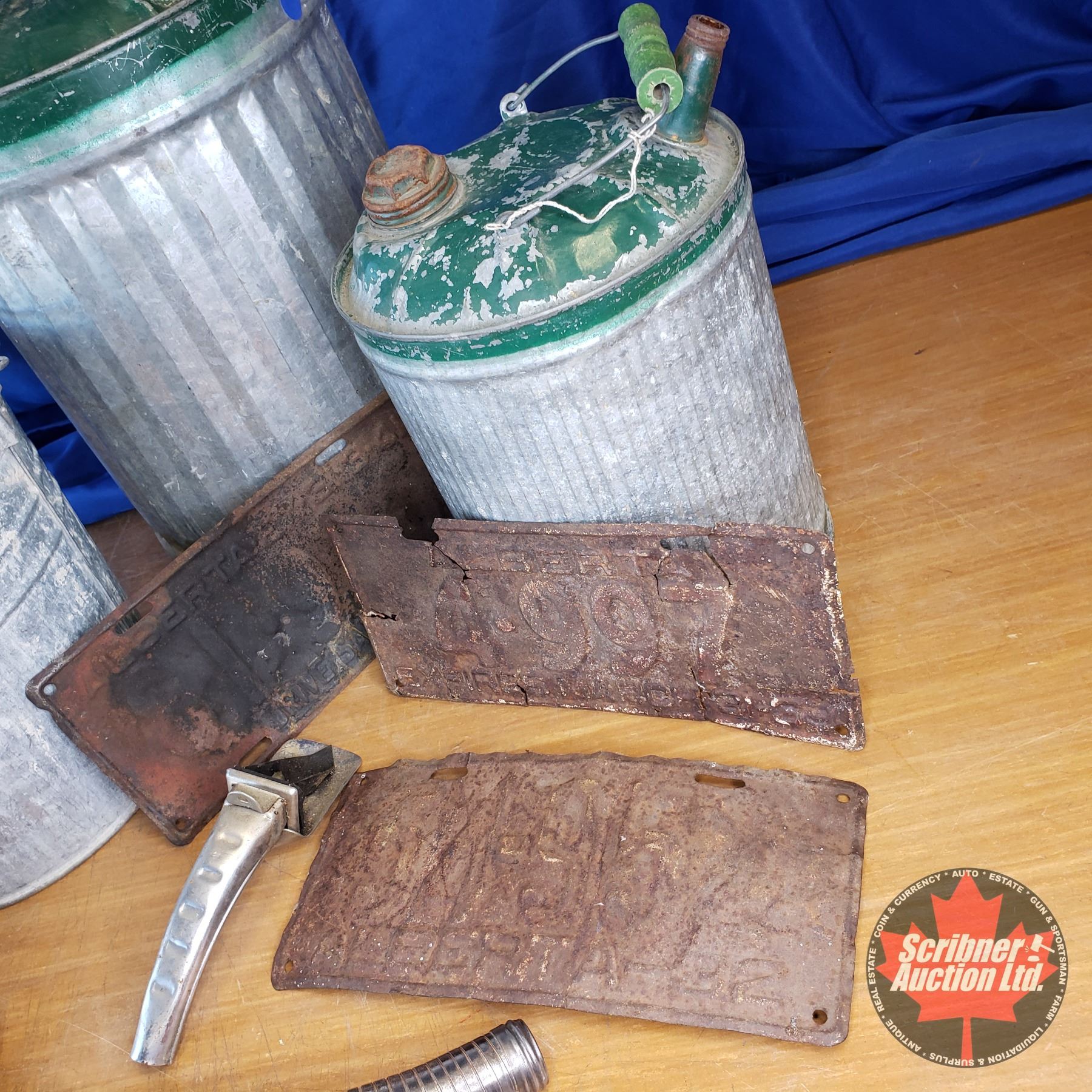 Gas Cans (2), Oil Spout, Lic Plates, Enamel Gas Pump Sign, 1 Quart Jug