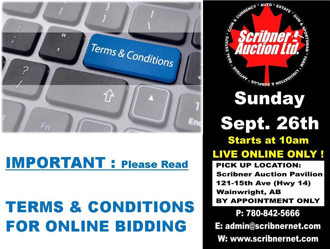 After an item has been sold, that item is the sole responsibility of the purchaser. All merchandise is sold AS IS/WHERE IS. No Guarantees or Warranties Given or Implied. Scribner Auction is not responsible for missing parts. No bidder shall retract his/her bid. All sales are final. Open house Preview on Thursday September 23rd from 2pm - 7pm at the Auction location (121 - 15 Ave Wainwright, AB) AND ONLY IF SAFE TO DO SO DURING COVID 19 GOVERNMENT REGULATIONS.