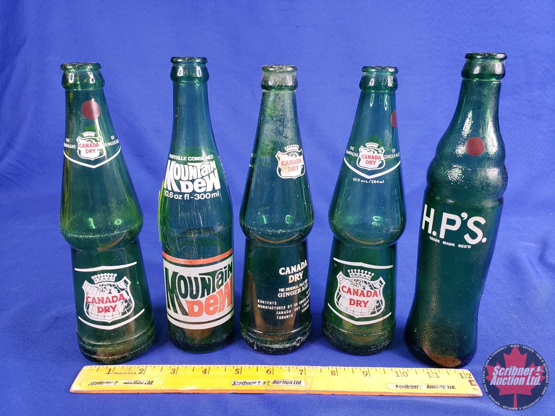 Green Glass Pop Bottles (5): Canada Dry (3), Mountain Dew & H.P'S. (H.P'S Measures : 10"H) (SEE PICS!)