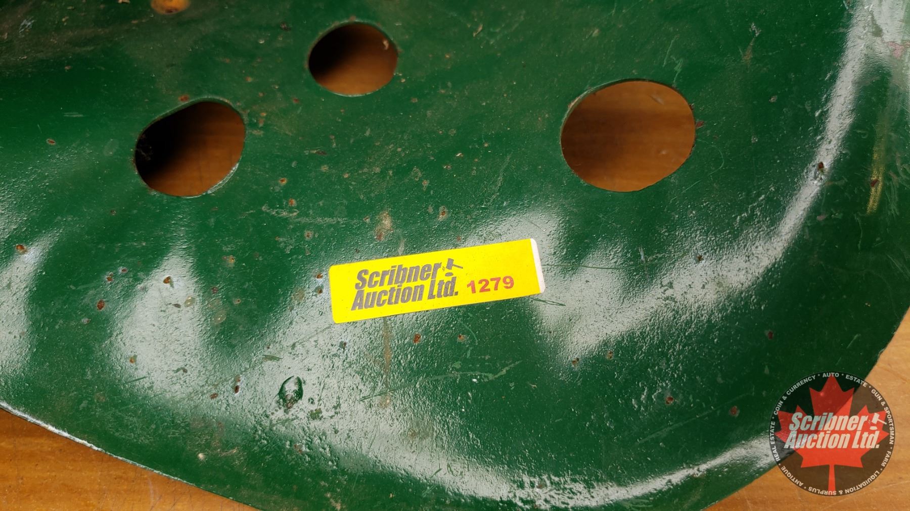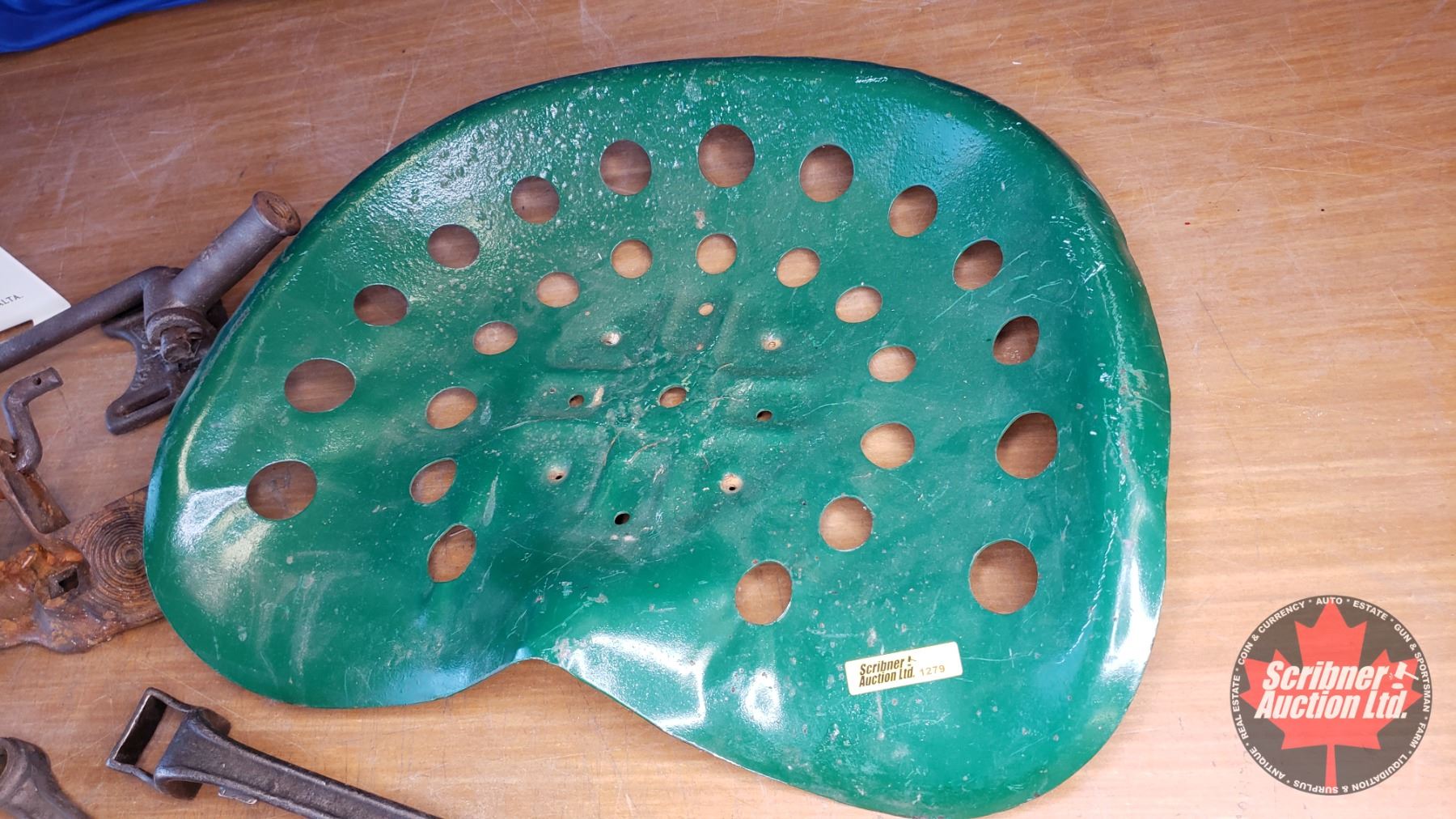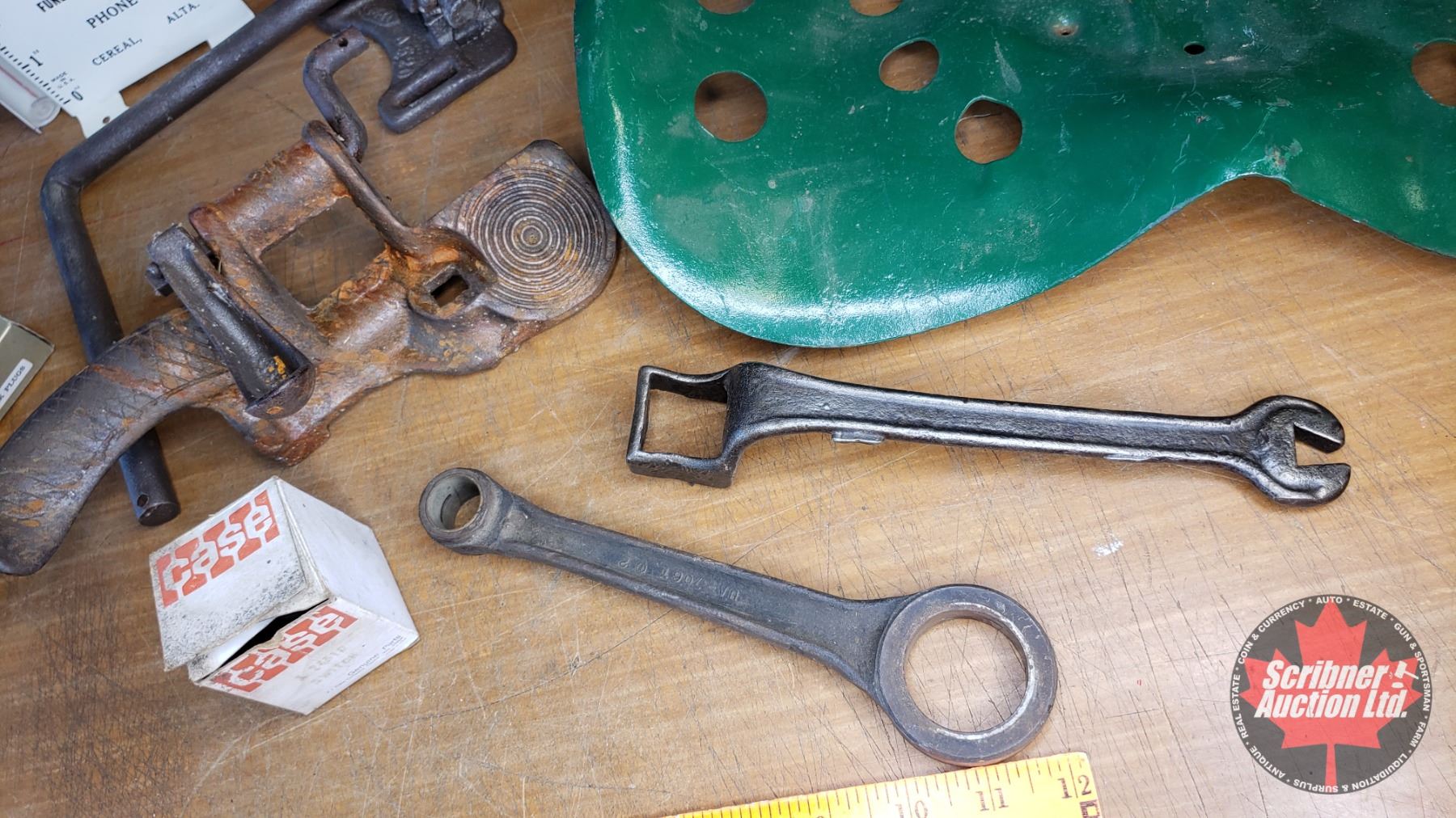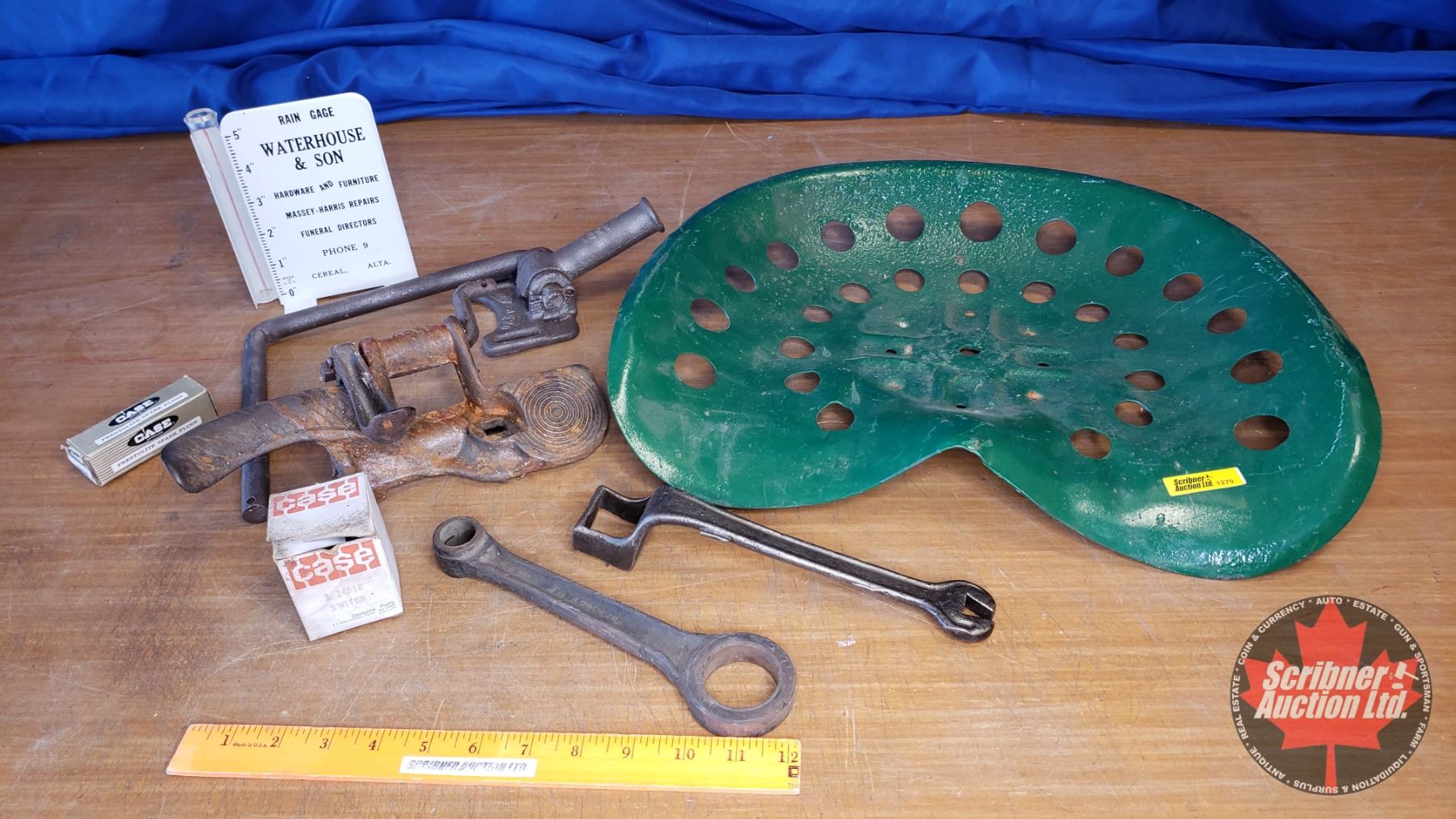 Green Steel Implement Seat c/w Variety of Massey-Harris, Foot Pedals, Box End Wrench, Connecting Rod, Rain Gauge & Case Prestolite Spark Plug (See Pics!)