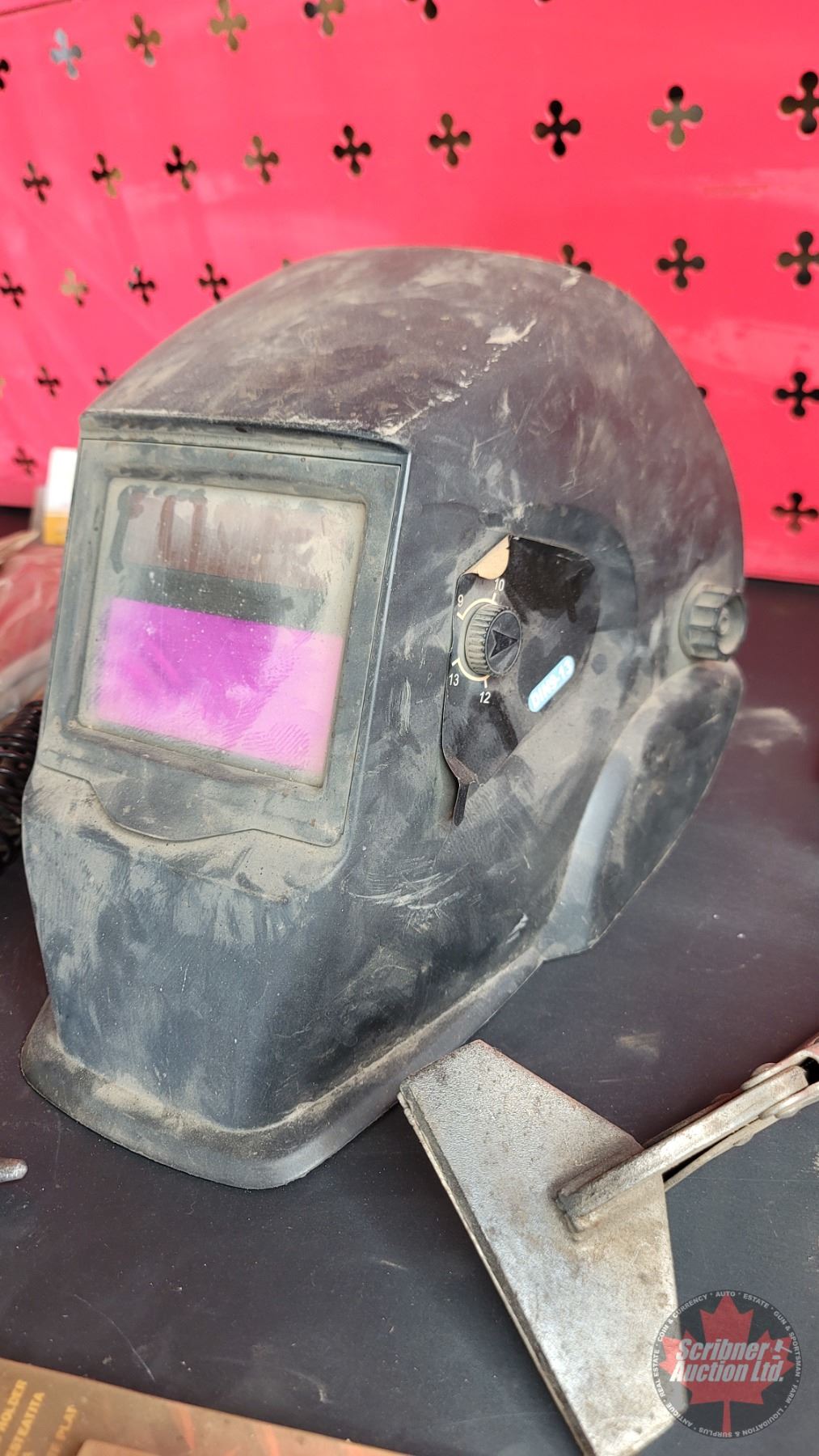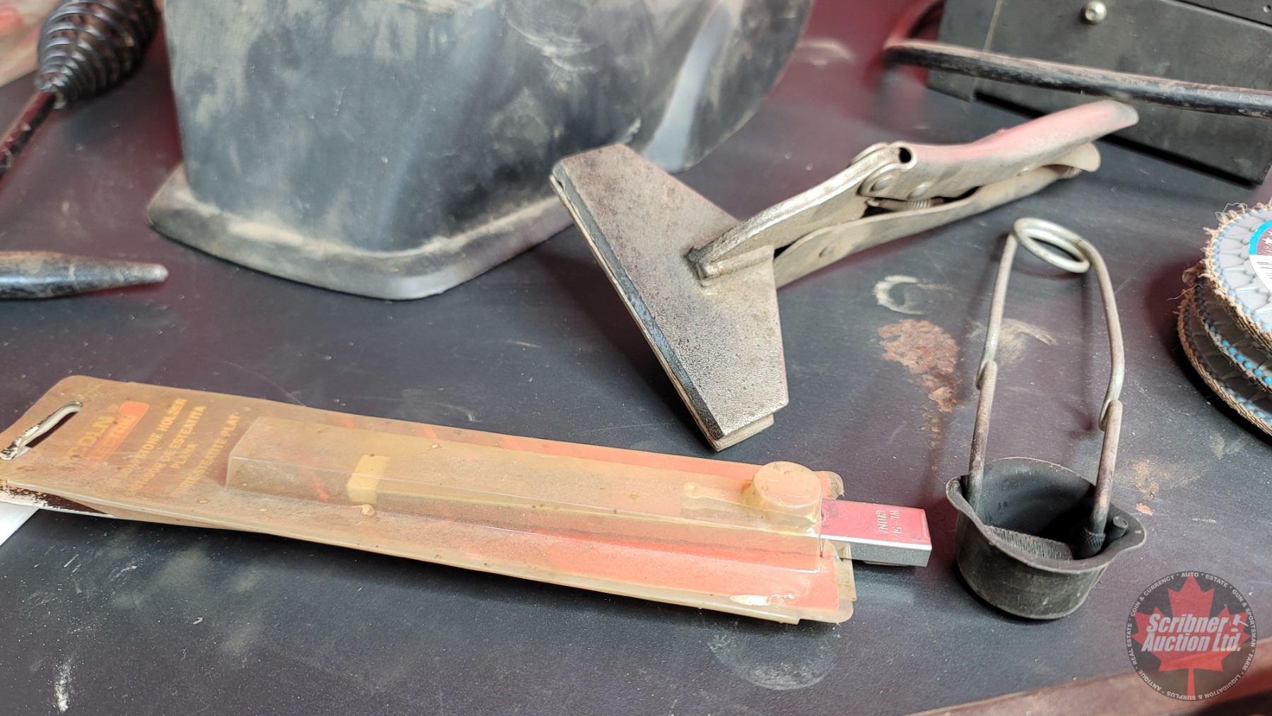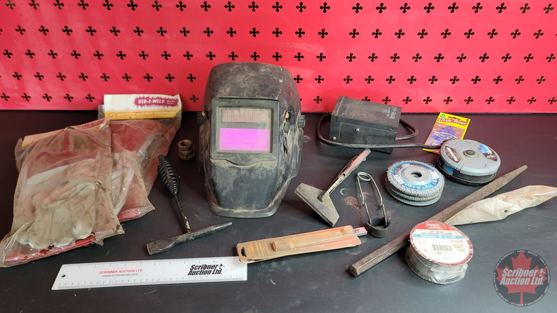 Grouping: Auto Darkening Welders Helmet; Welding Gloves (2 New Pairs); Chipping Hammer; Vise Grips; Flux Core Wire