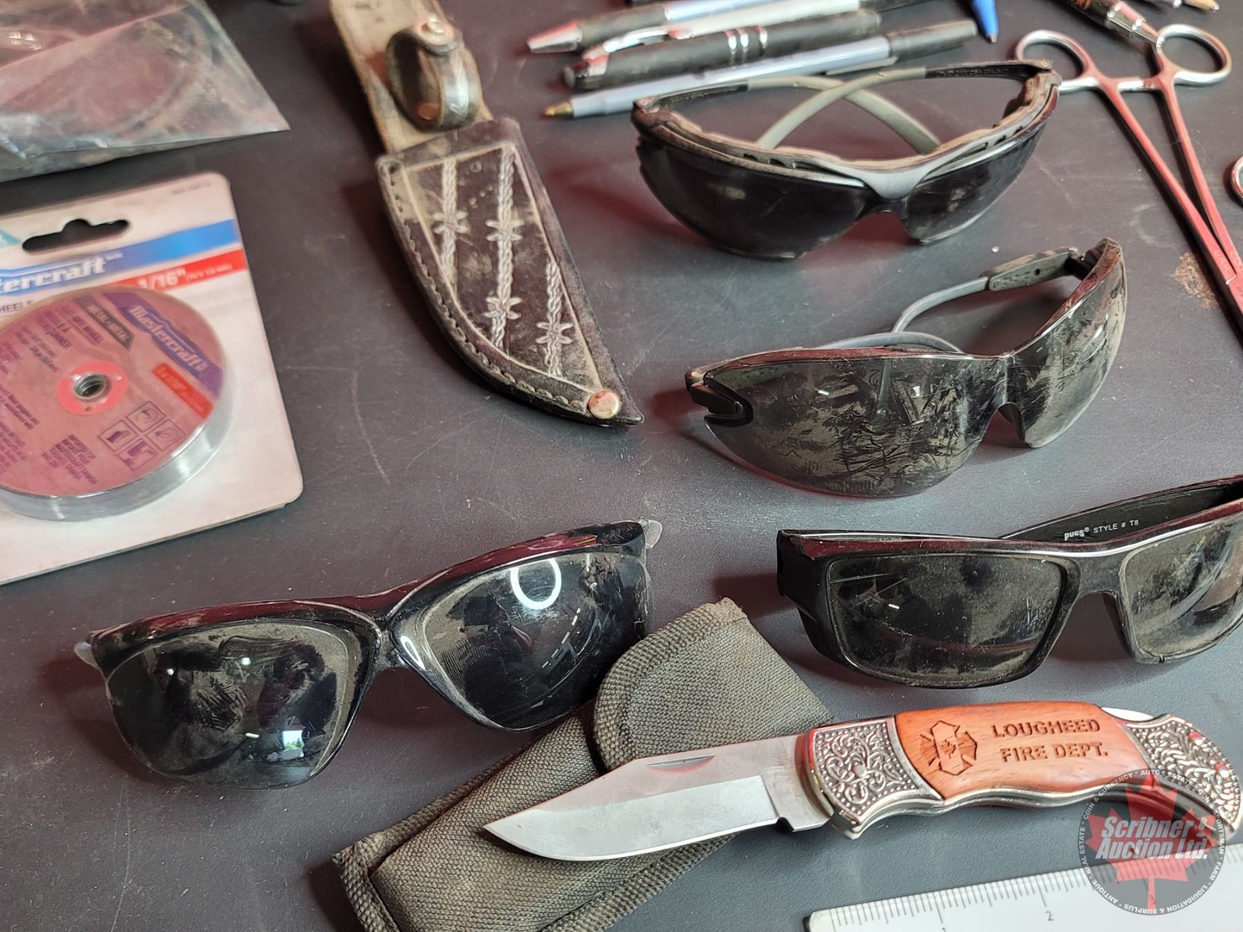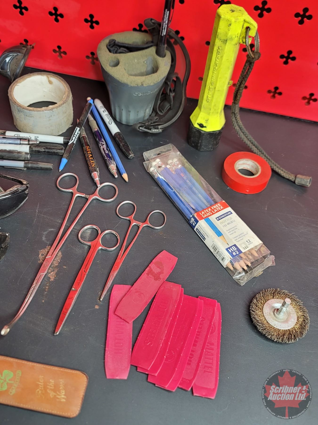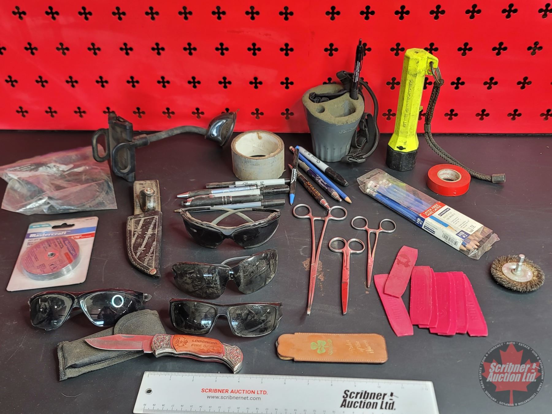 Grouping: Safety Glasses; Forceps; Pencils; Lock Blade Knife; Cut Off Wheels; etc