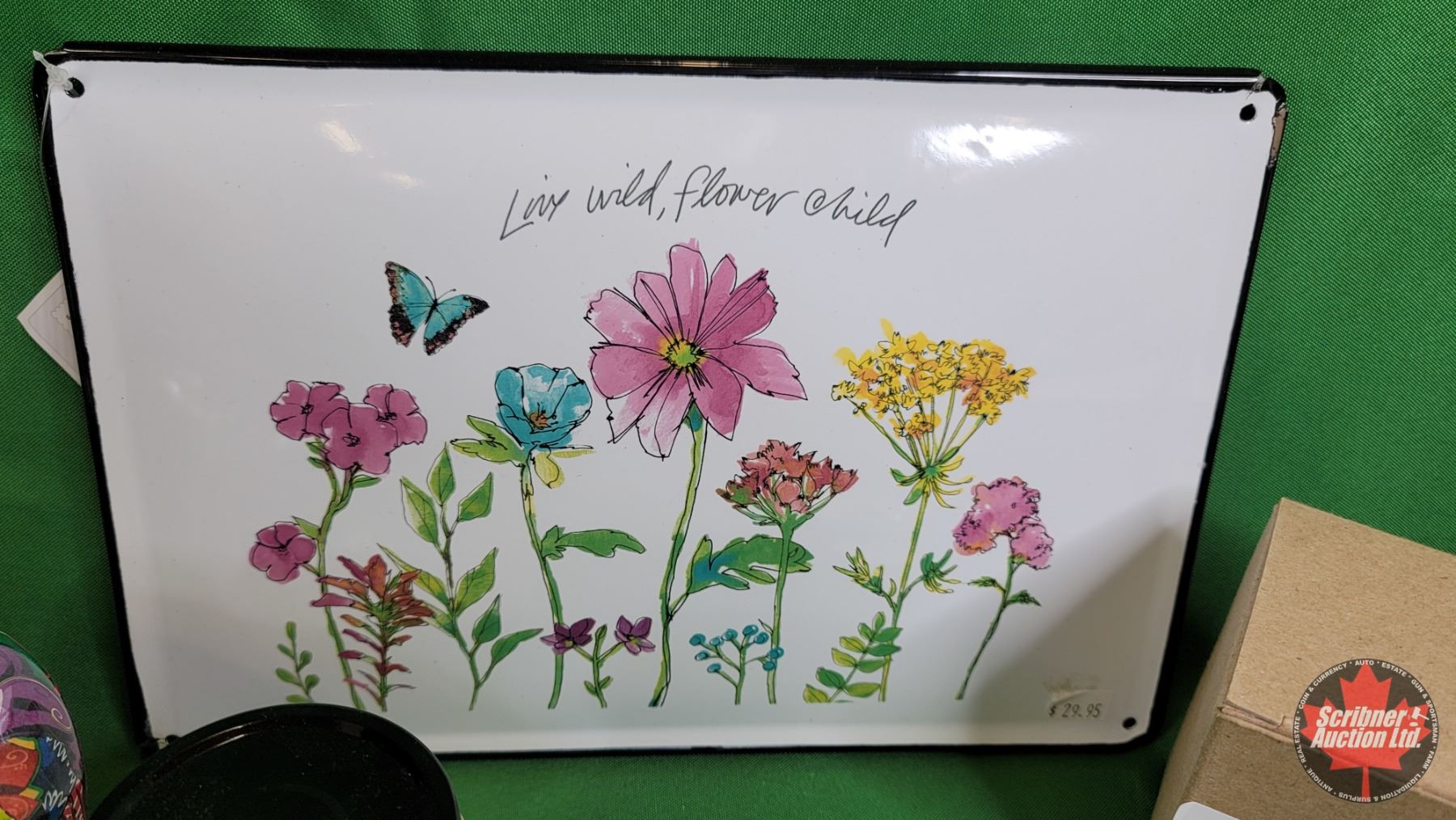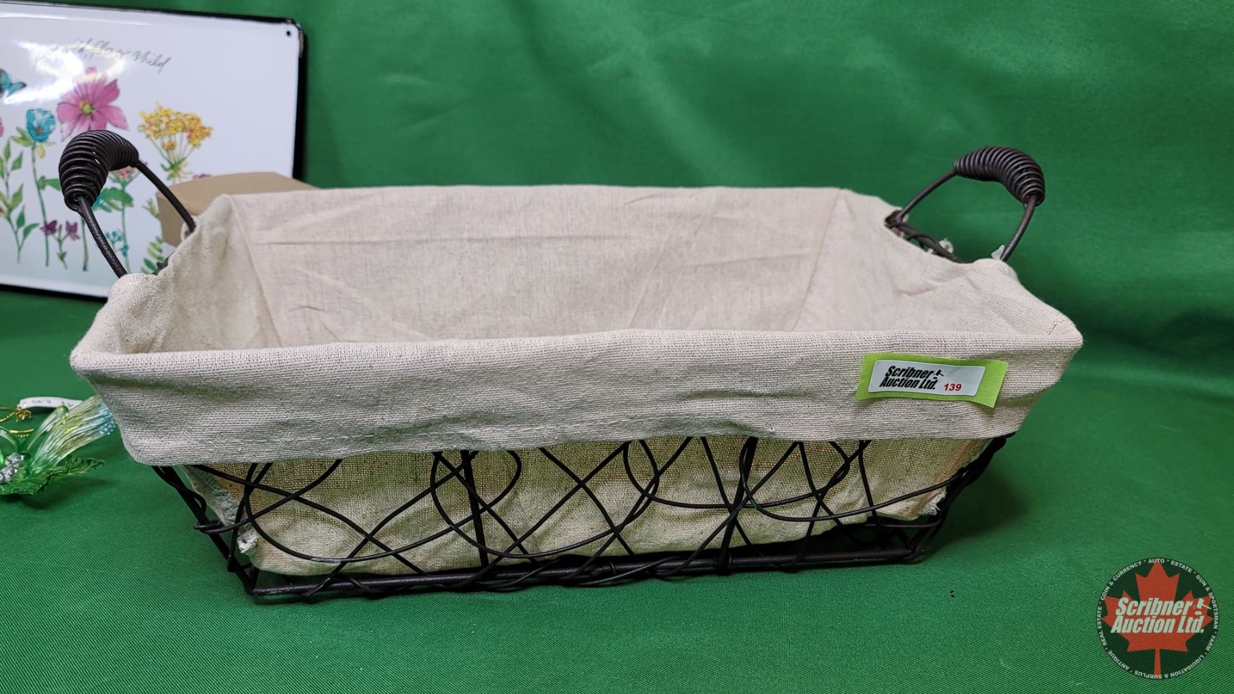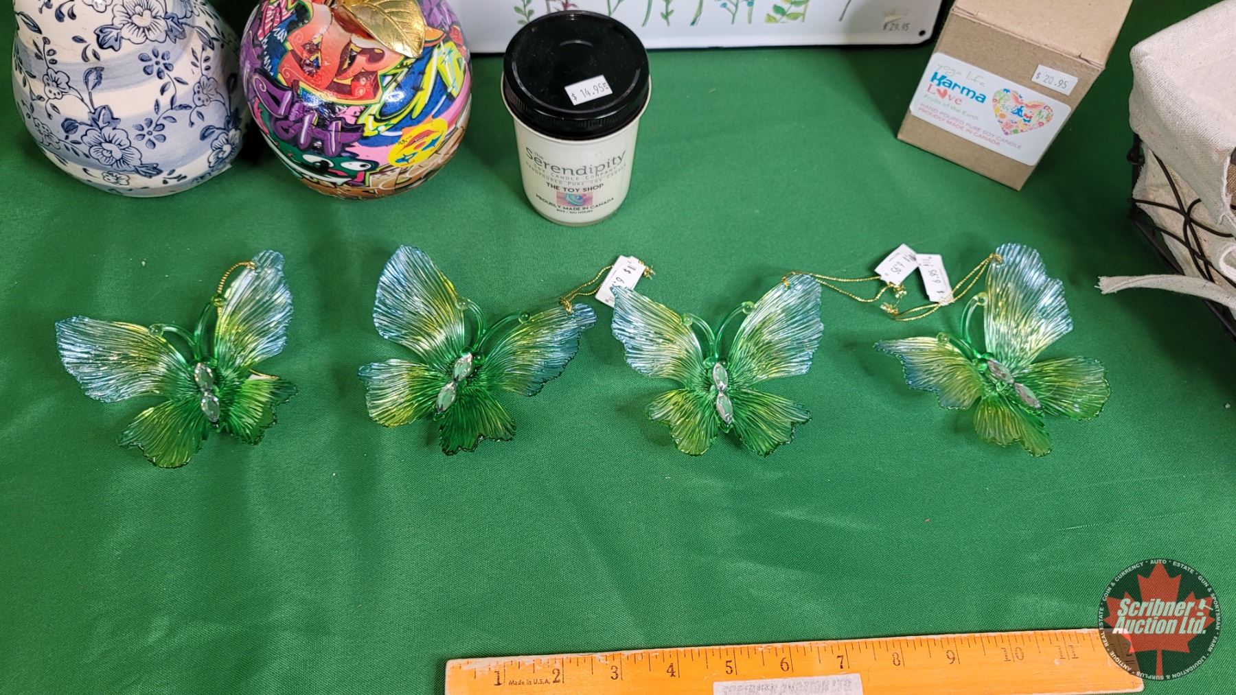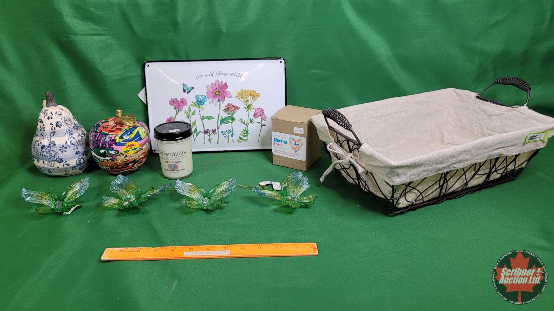 HOME DÉCOR / Giftware Items : Wire Basket/Fabric Lined; Wall Décor Plaque; Décor Fruit (Apple & Pear; Butterflies (4); Serendipity Candle (Basket Measures 7"H x 16-1/2"W x 9-3/4"D) (SEE PICS!) (This LOT is NEW STOCK ~ STORE DISPERSAL)