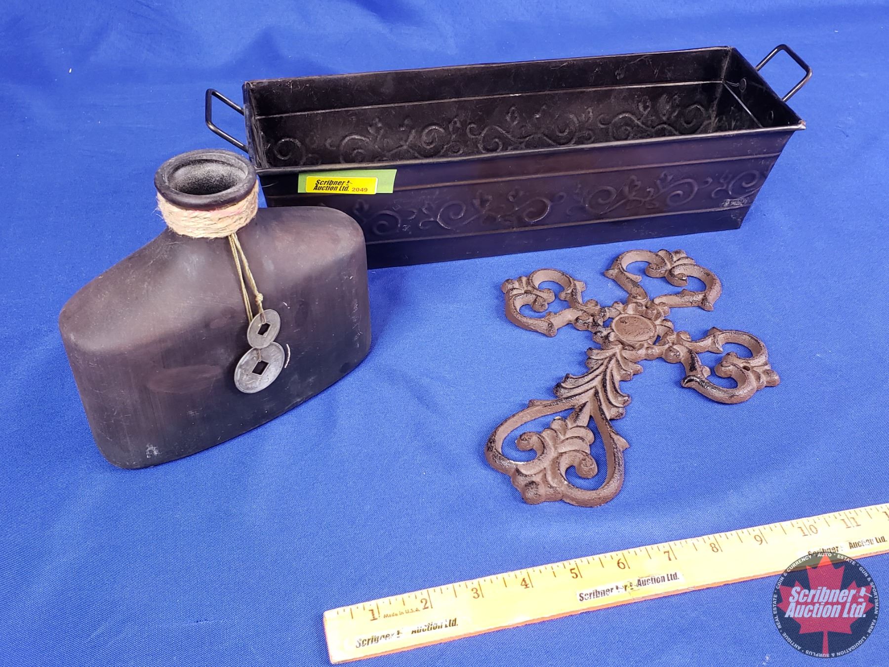 HOME DÉCOR : Indoor Plant Basket w/Cast Iron Cross & Bottle (Basket Measures : 4"H x 14"W x 5"D) (SEE PICS!)