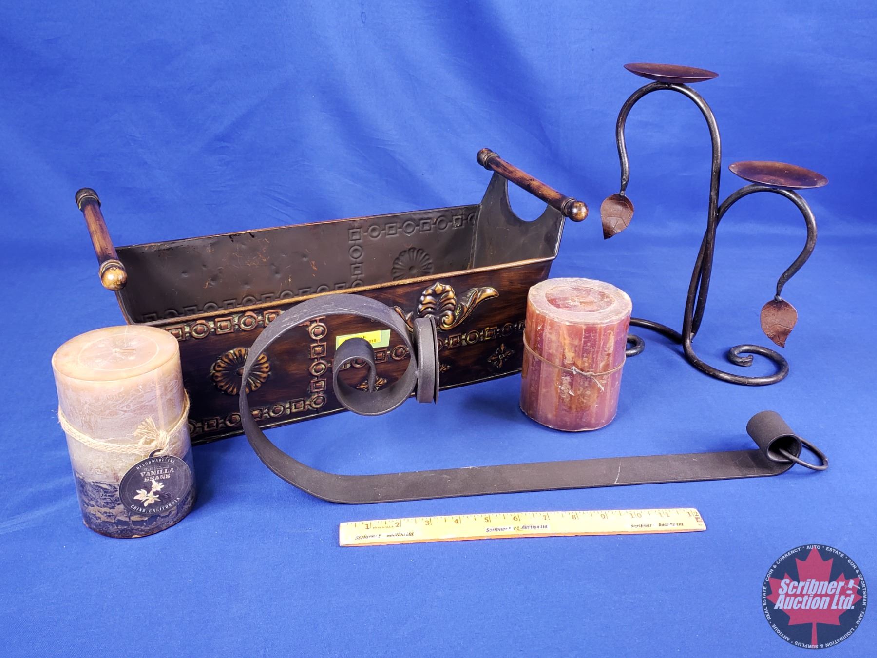 HOME DÉCOR : Tin Basket w/Candle Holders (2) & Candles (2) (Basket Measures : 5-3/4"H x 16-1/4"W x 7-1/4"D) (SEE PICS!)