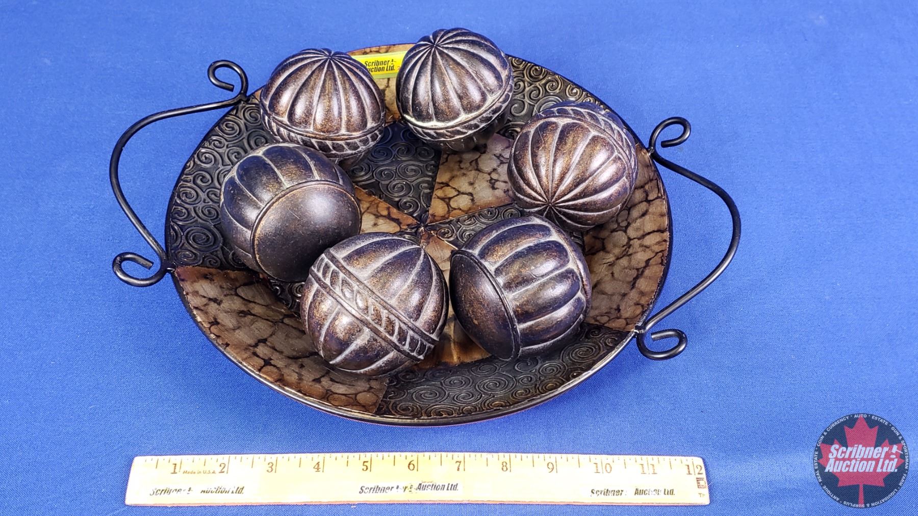 HOME DÉCOR : Tin Trinket Plate w/Accent Balls (6) (Note : One Damaged) (Tray Measures : 2-1/2"H x 12"Dia) (SEE PICS!)