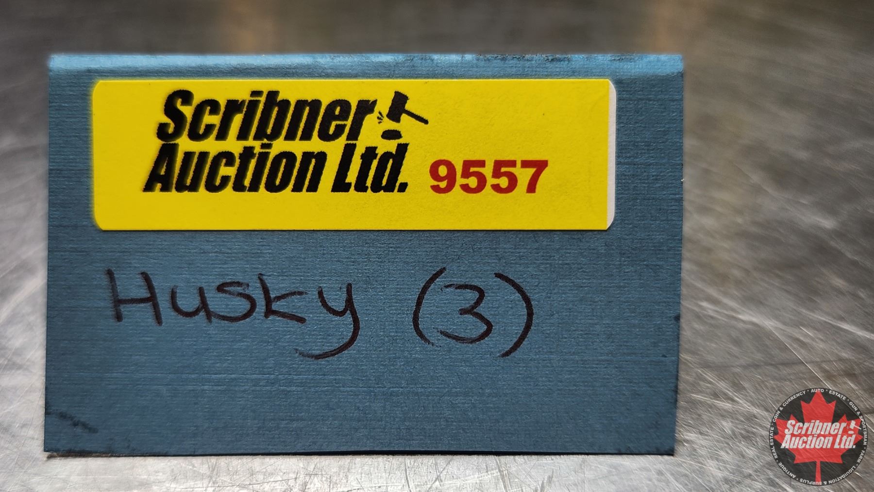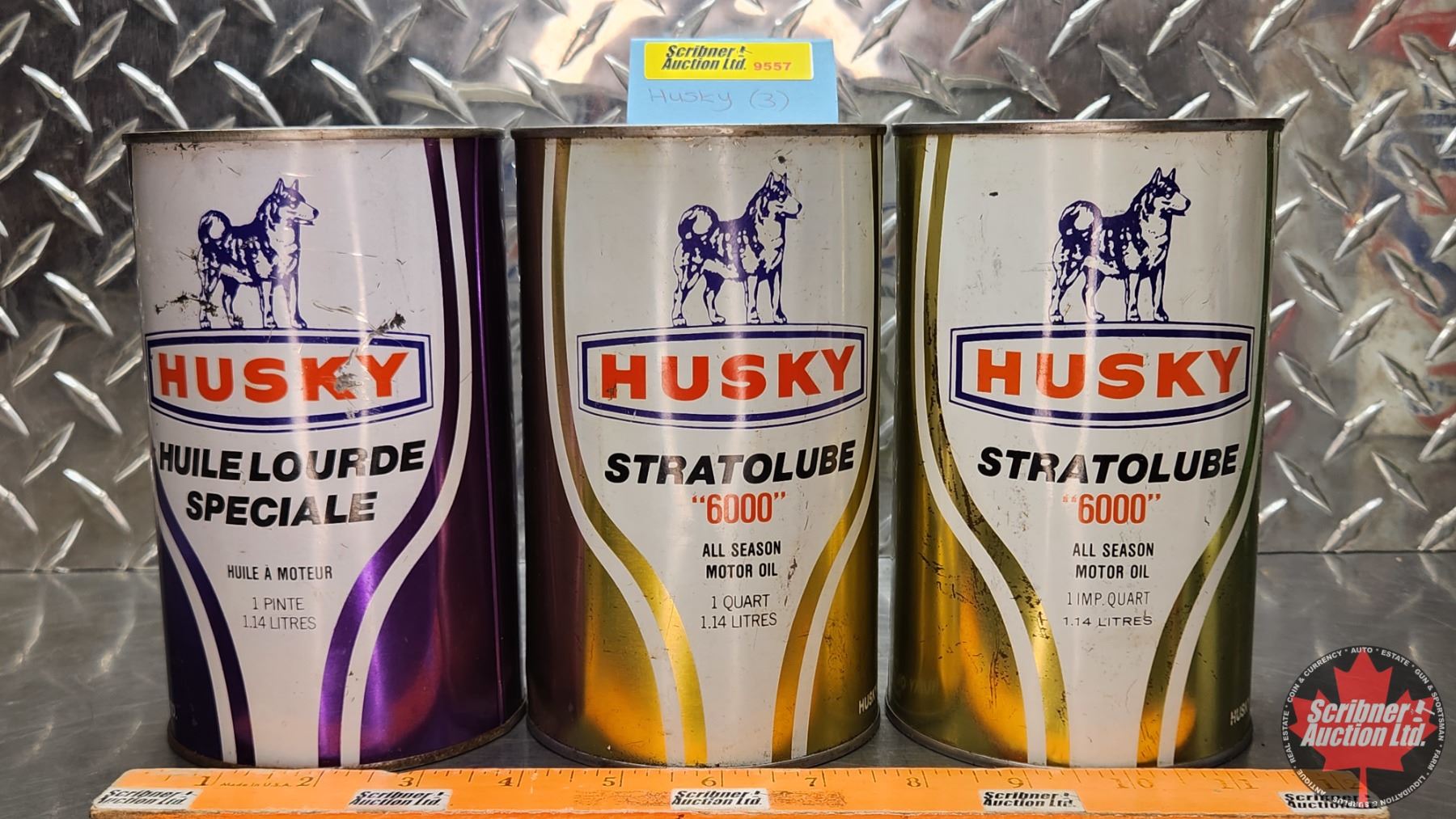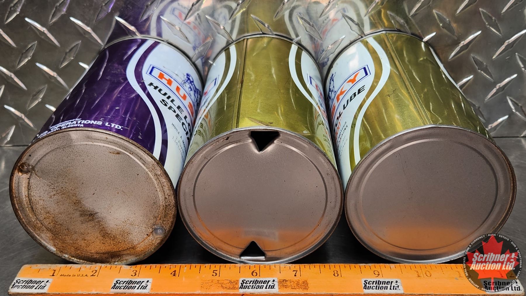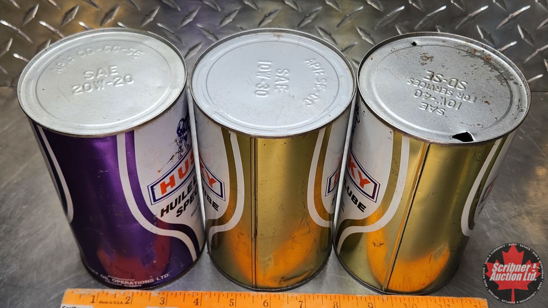 HUSKY OIL TIN TRIO : Heavy Duty Special & Stratolube 6000 (2) (6-1/2"H x 4"Dia) (SEE PICS!)
