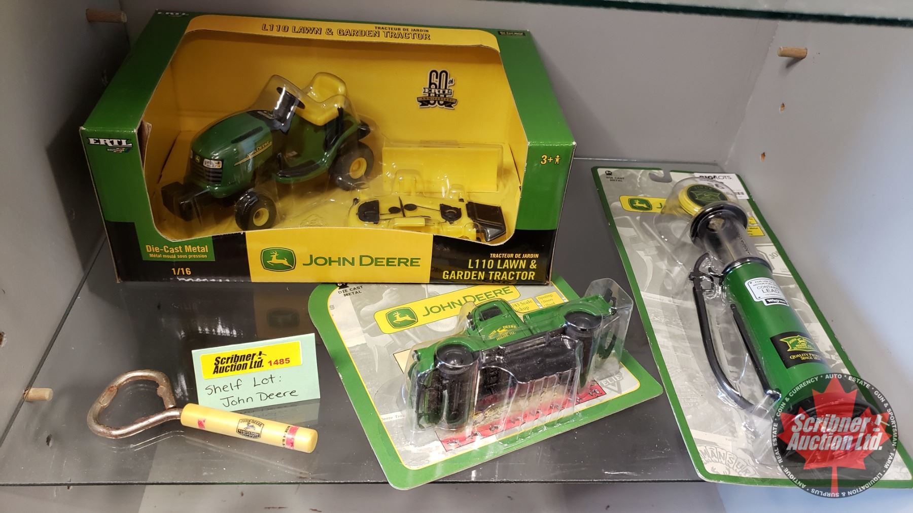 John Deere Collectibles : Die Cast 1/16 Scale L10 Lawn Garden Tractor, Die Cast 1920's Style Gas Pump, 1/43 Scale Pick Up & Bottle Opener (See Pics)