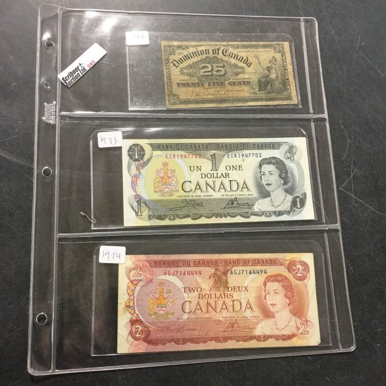 Canada Bills (3): 1900 Shinplaster; 1973 $1; 1974 $2