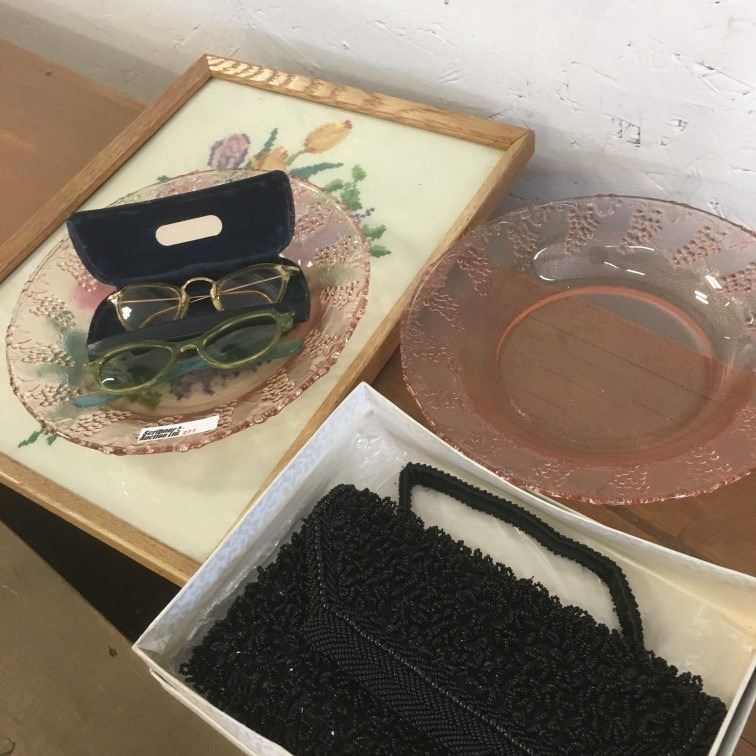 Framed Print w/Ladies Black Purse & 2 Pairs Horn Rimmed Glasses