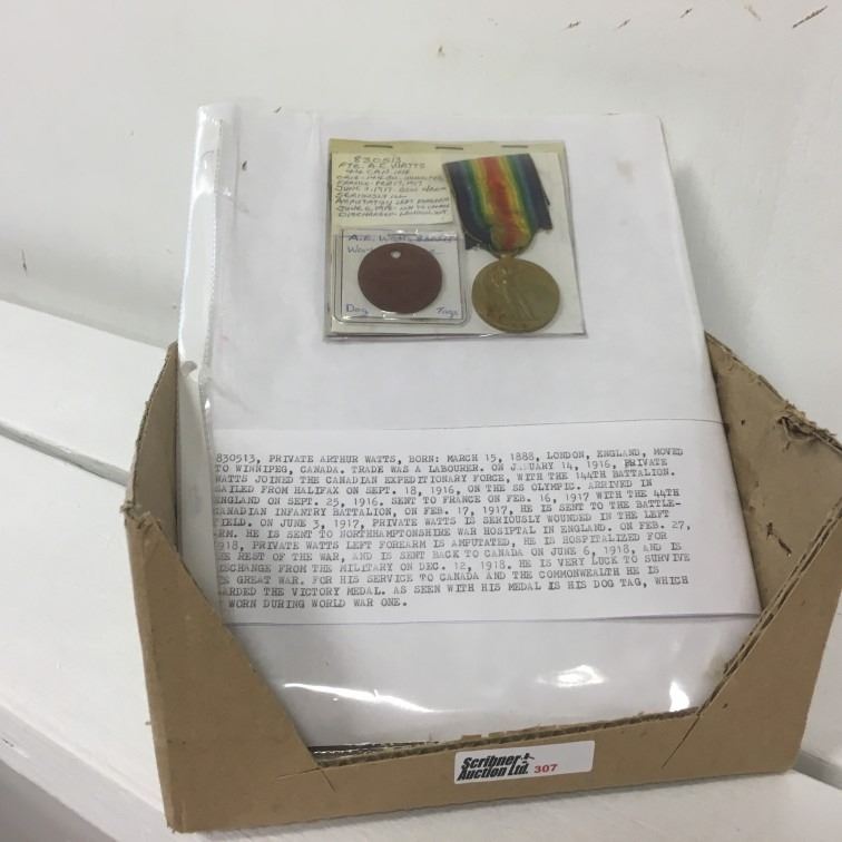 44 Canadian Infantry "Victory Medal" & Dog Tag "Private Arthur Watts" & Attestation Papers