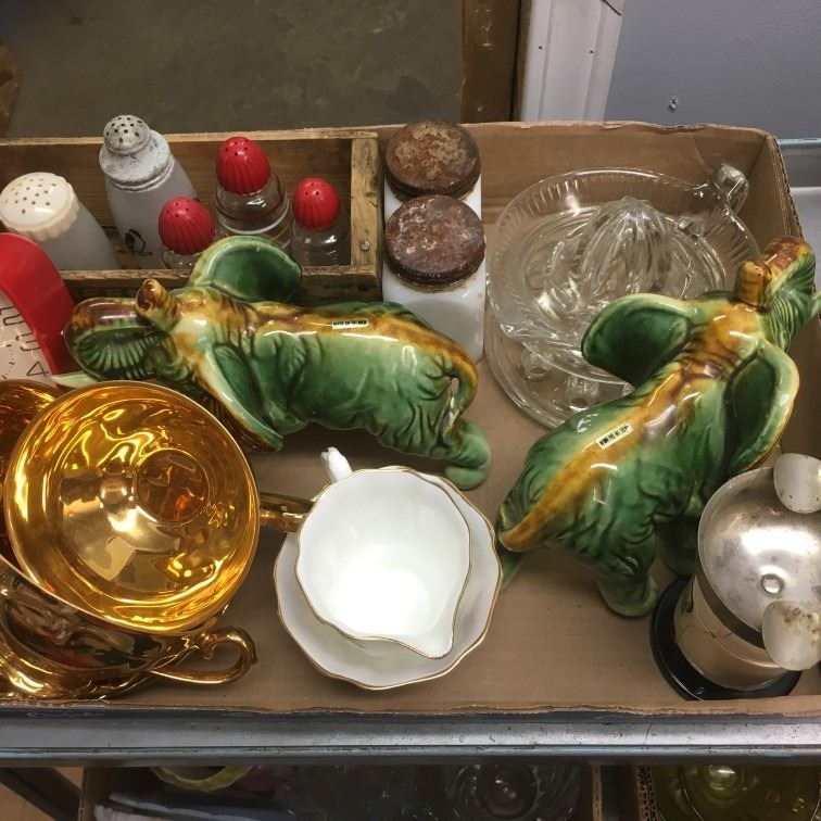 Gold Tea Cups, S&P, Elephant Ornaments, etc