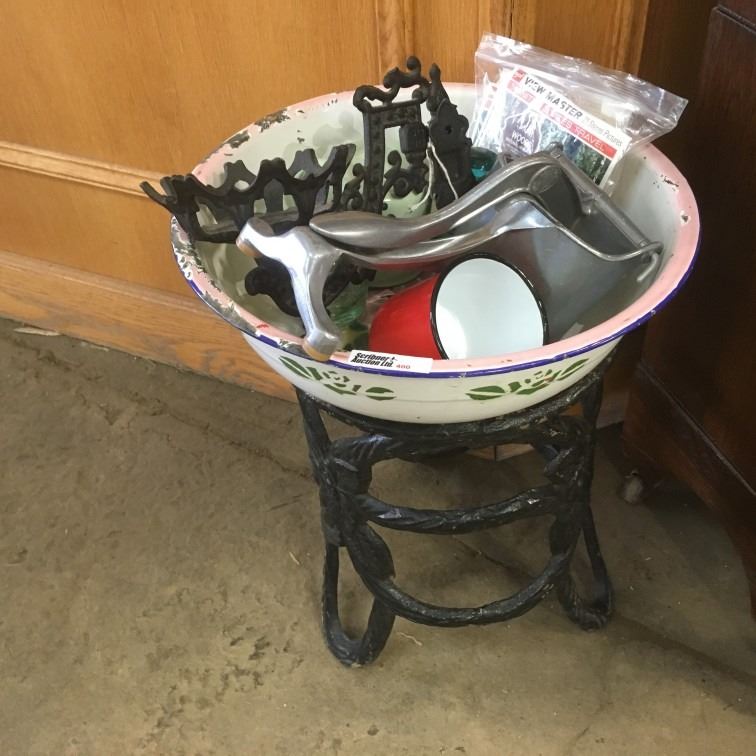 Cast Iron Stand w/Enamel Bowl, Insulator, Juicer, Mugs, Lamp Holder, View Master Reels, Jar