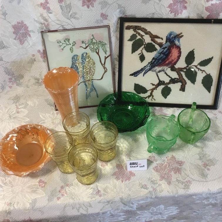 Shelf Lot: Variety (Depression Glass, Needlework Pics)