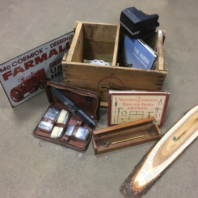 LOT440: Wooden Calgary Beverages Crate w/Books, Crib Board, Polaroid Camera, Tin Sign, etc