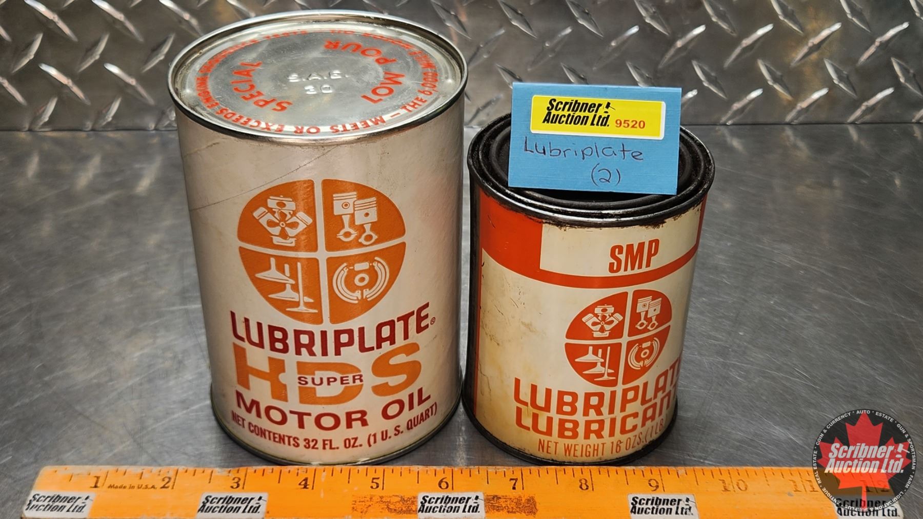 LUBRIPLATE TINS (2) : Super HDS Motor Oil (Cardboard) & SMP Lubricant (Both Full) (Largest Measures : 5-1/2"H x 4"Dia) (SEE PICS!)