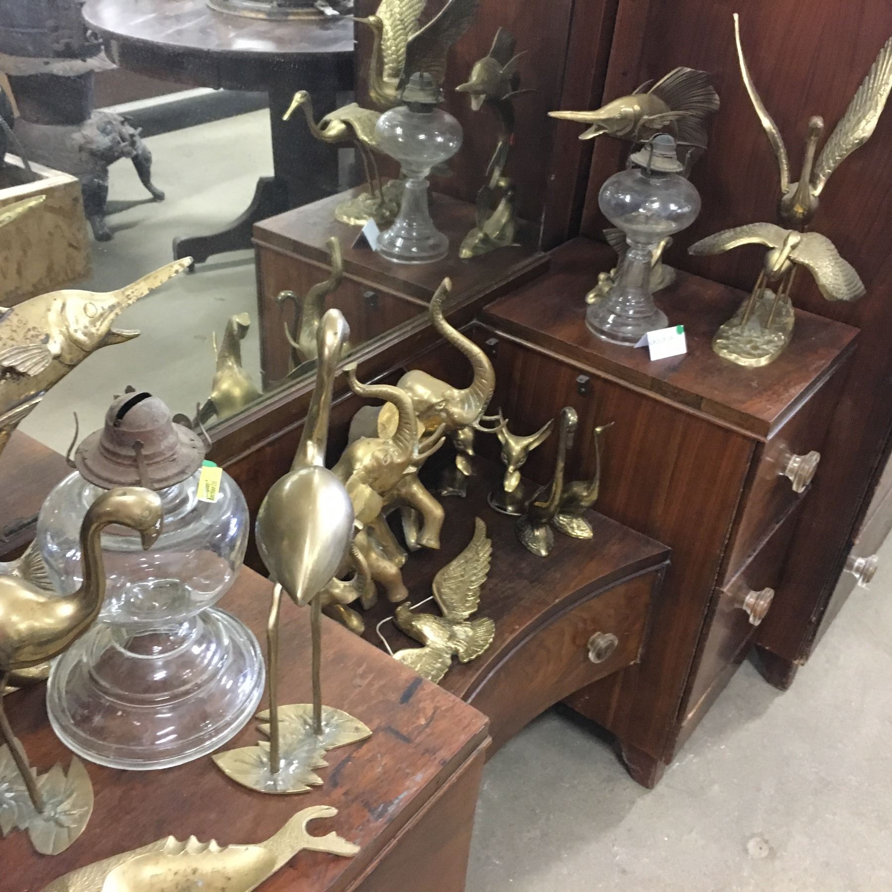Large Brass Group & 2 Glass Oil Lamps