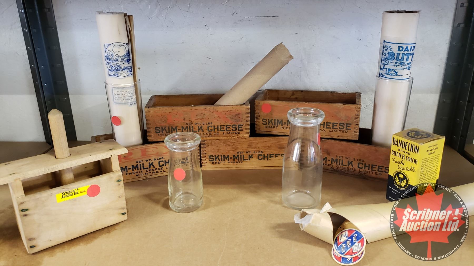 Large Dairy Collection : Milk Bottles, Cheese Boxes, Butter Press, Pogs, Butter Block Wrap, etc