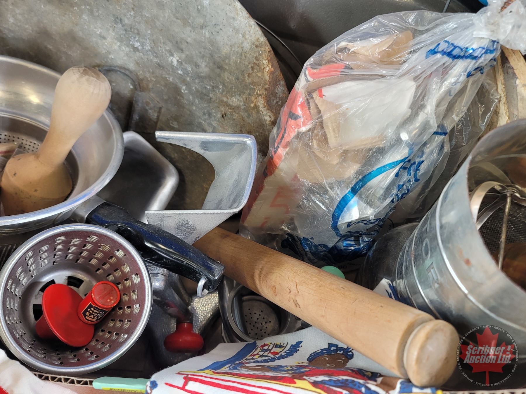Large Vintage Collector Combo : Laundry Sacks, Flour Sifters, Kitchen Utensils, Crock Butter Churn Paddle, Lids, Apron, etc (SEE PICS!)