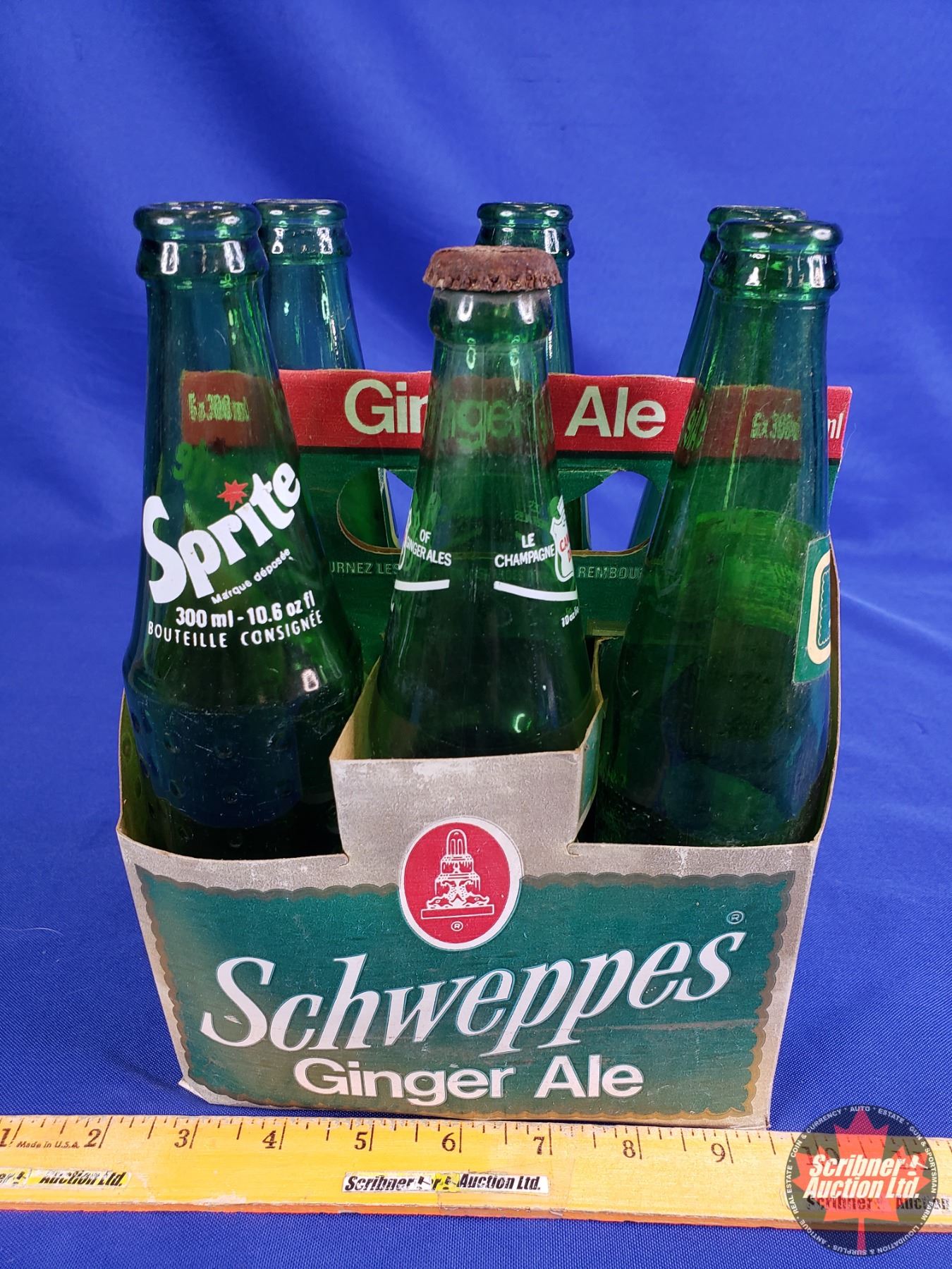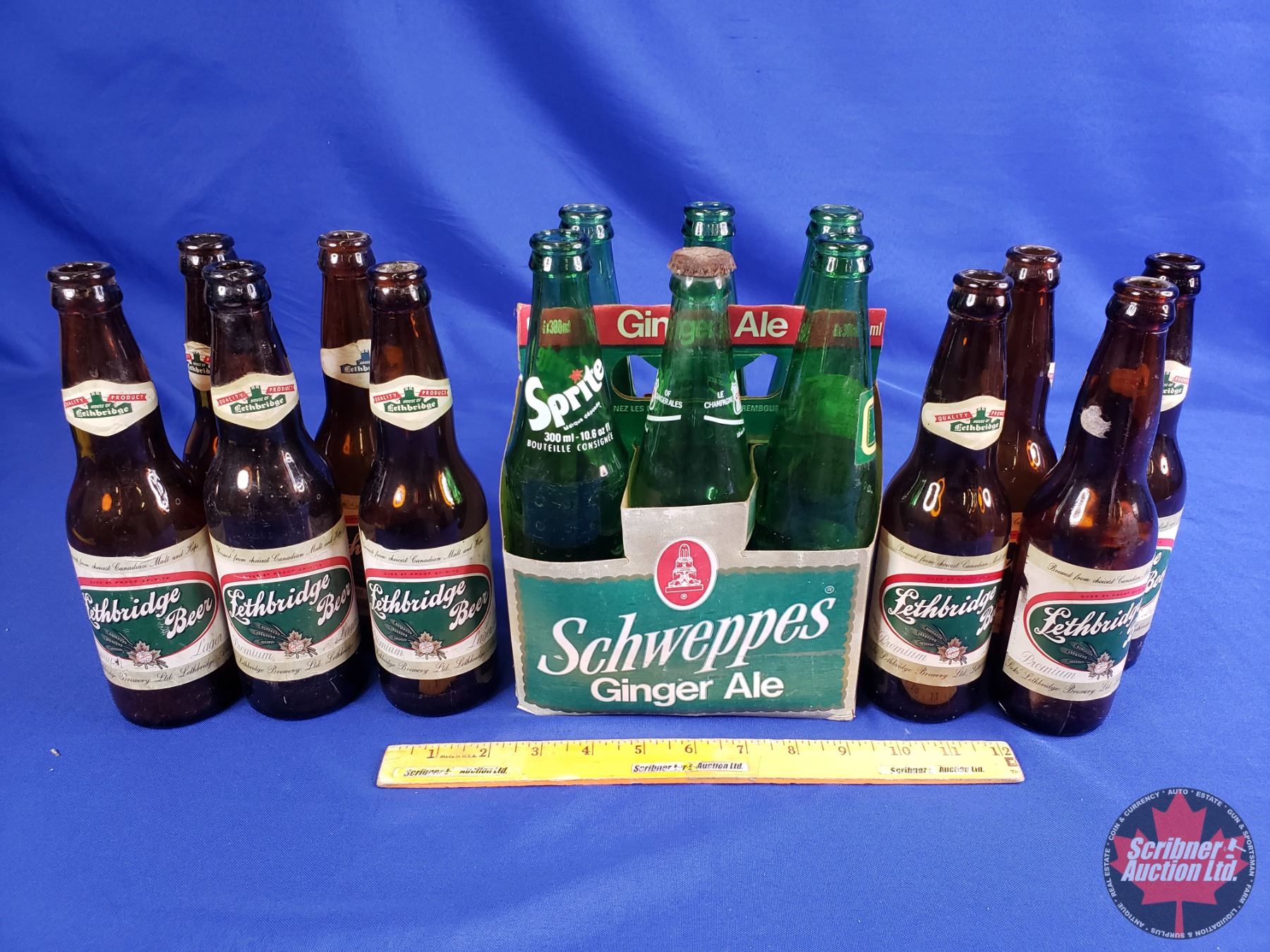 Lethbridge Beer Bottles (9), Variety Green Glass Pop Bottles (6) & 6 Bottle Cardboard Schweppes Ginger Ale Carrier (SEE PICS!)