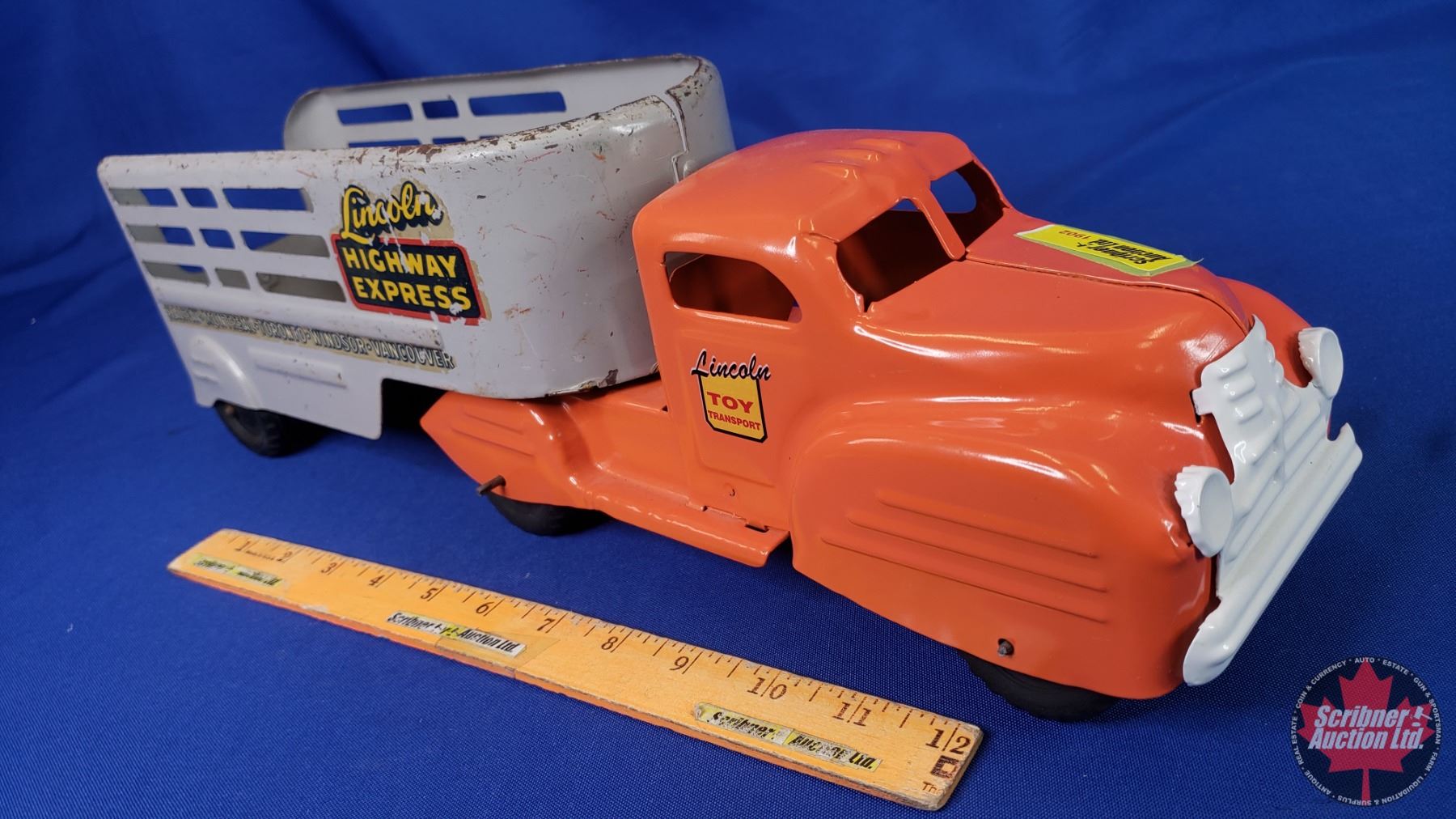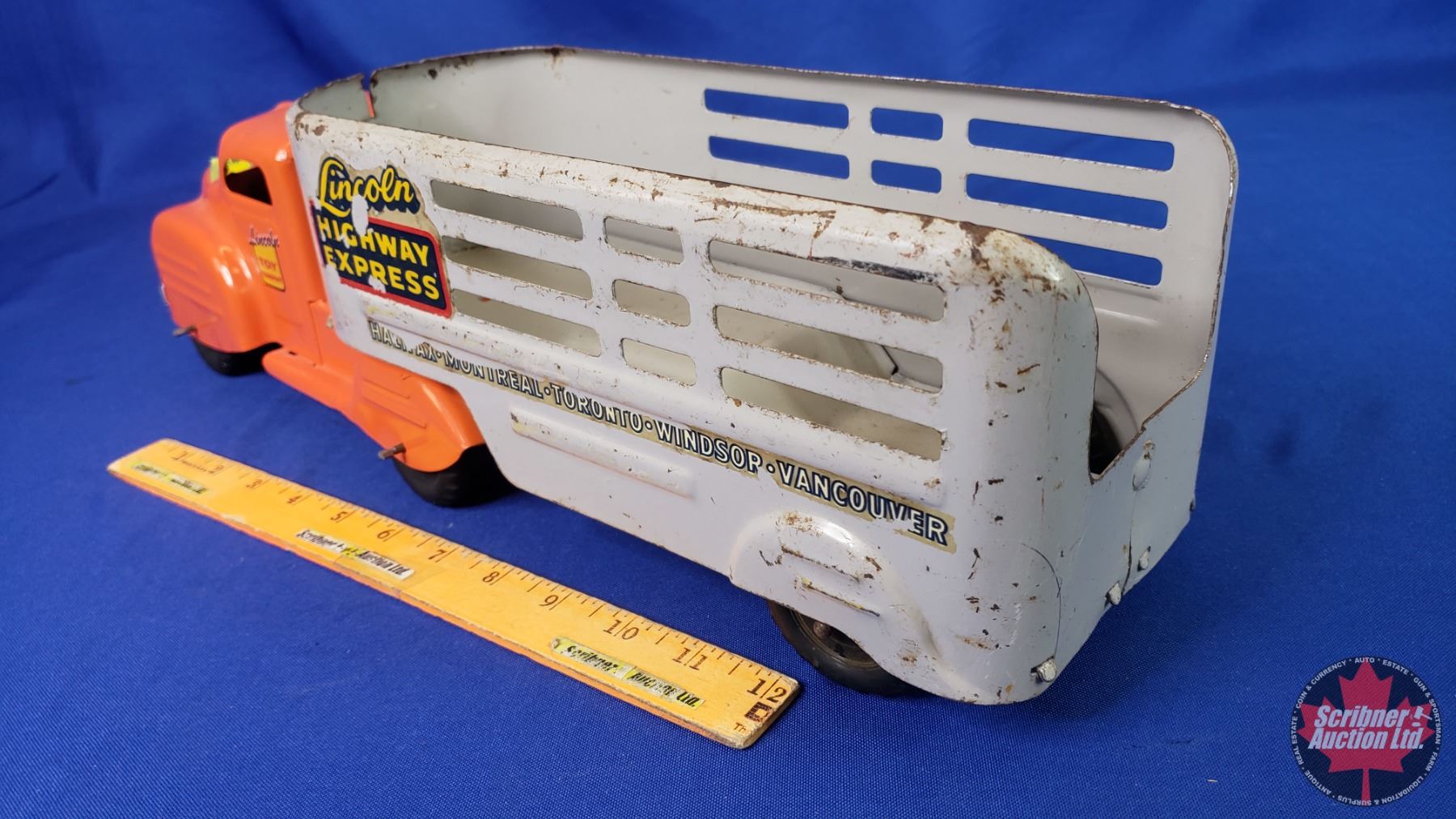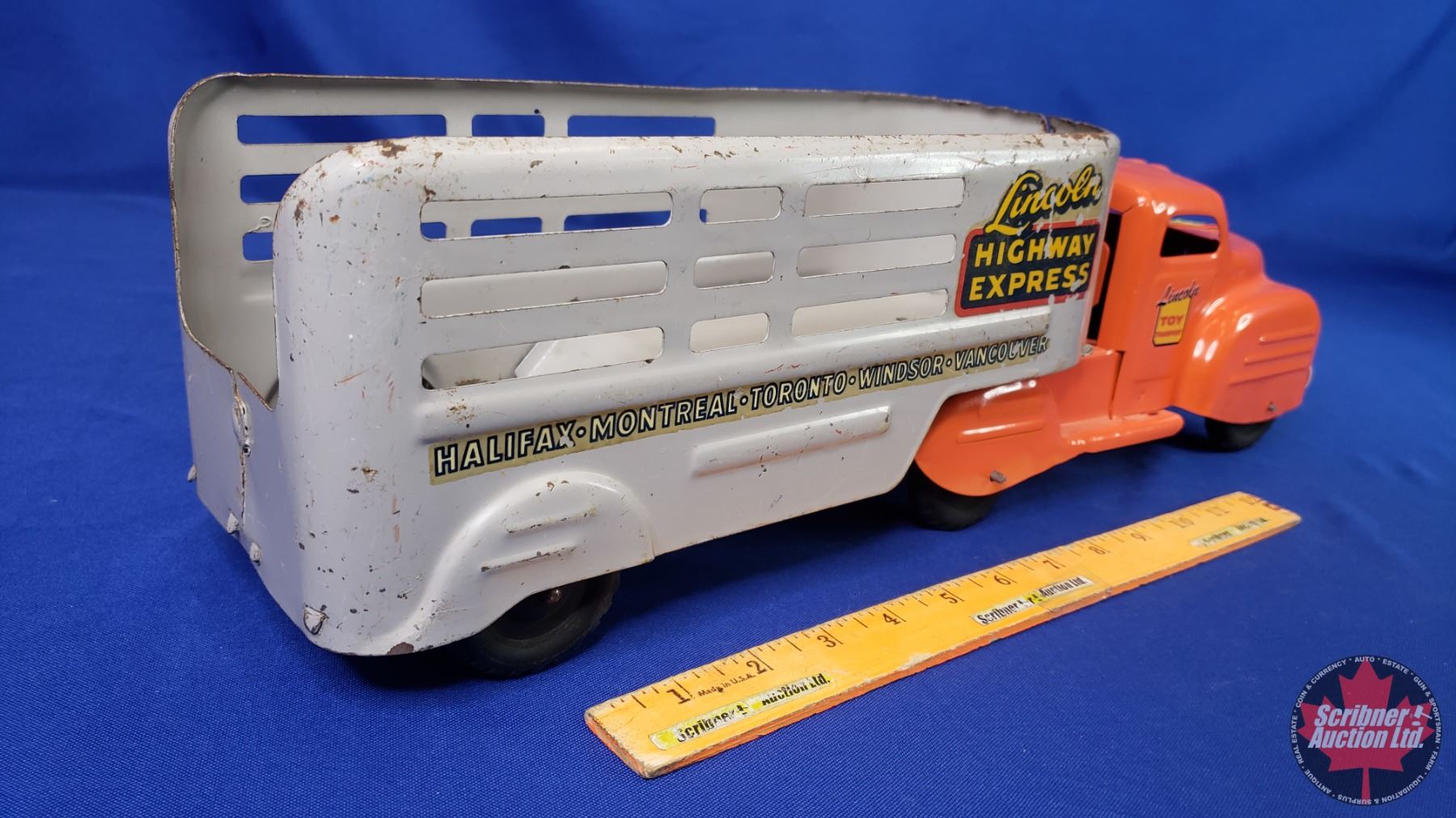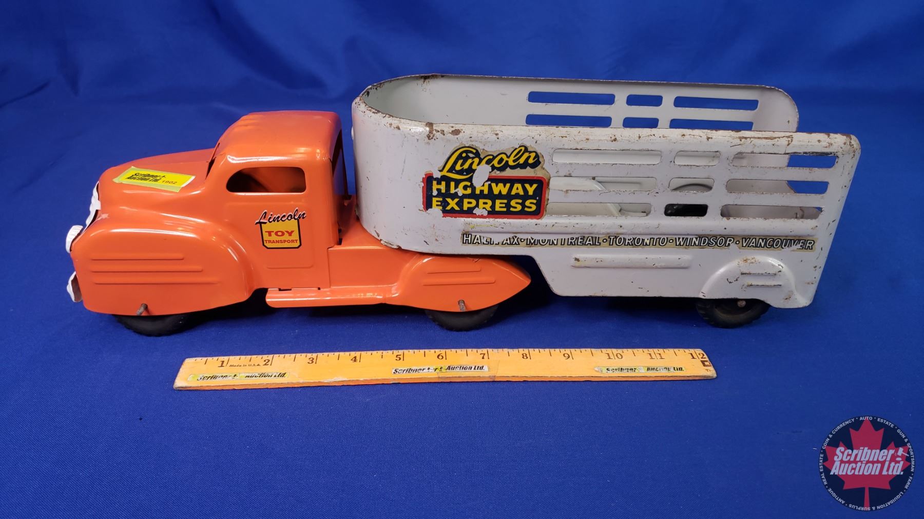 Lincoln Metal Truck & Hauler Trailer "Lincoln Toy Transport" "Lincoln Highway Express" (Truck may have been repainted) (5-1/2"H x 4-1/2"W x 18-1/2"L) (SEE PICS!)